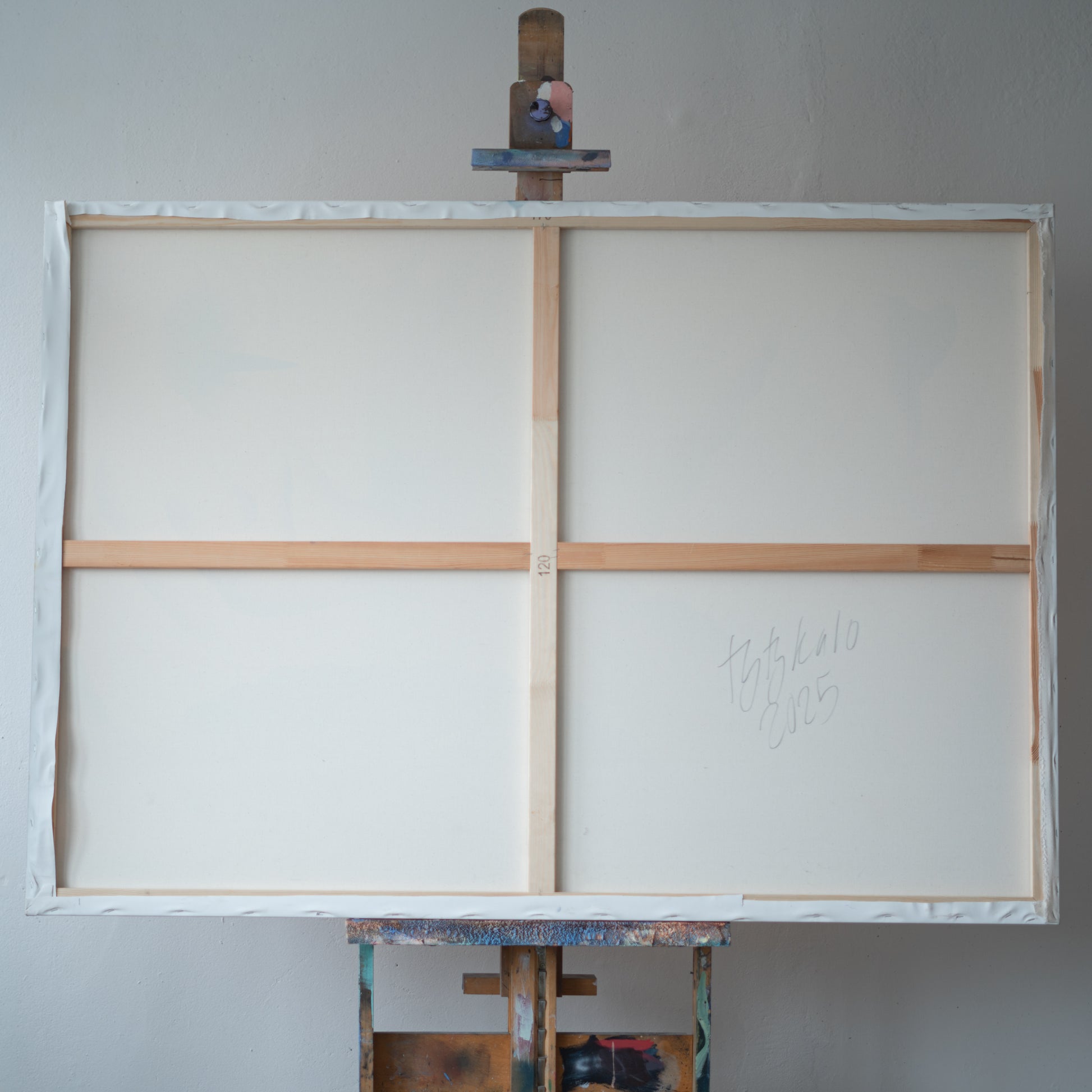 Obraz výrazného českého malíře je vystavěn na graficky strukturované kompozici a soustředěné práci s linií. Prolínání kresby, spreje a šablony vytváří napětí mezi přesně definovanými tvary a měkčími, volně se rozpíjejícími plochami. Výsledná scéna působí jako vizuální putování krajinou na hraně reality a vnitřních světů, v níž se vynořují archetypální obrazy hluboko uložené pod hladinou osobní paměti.