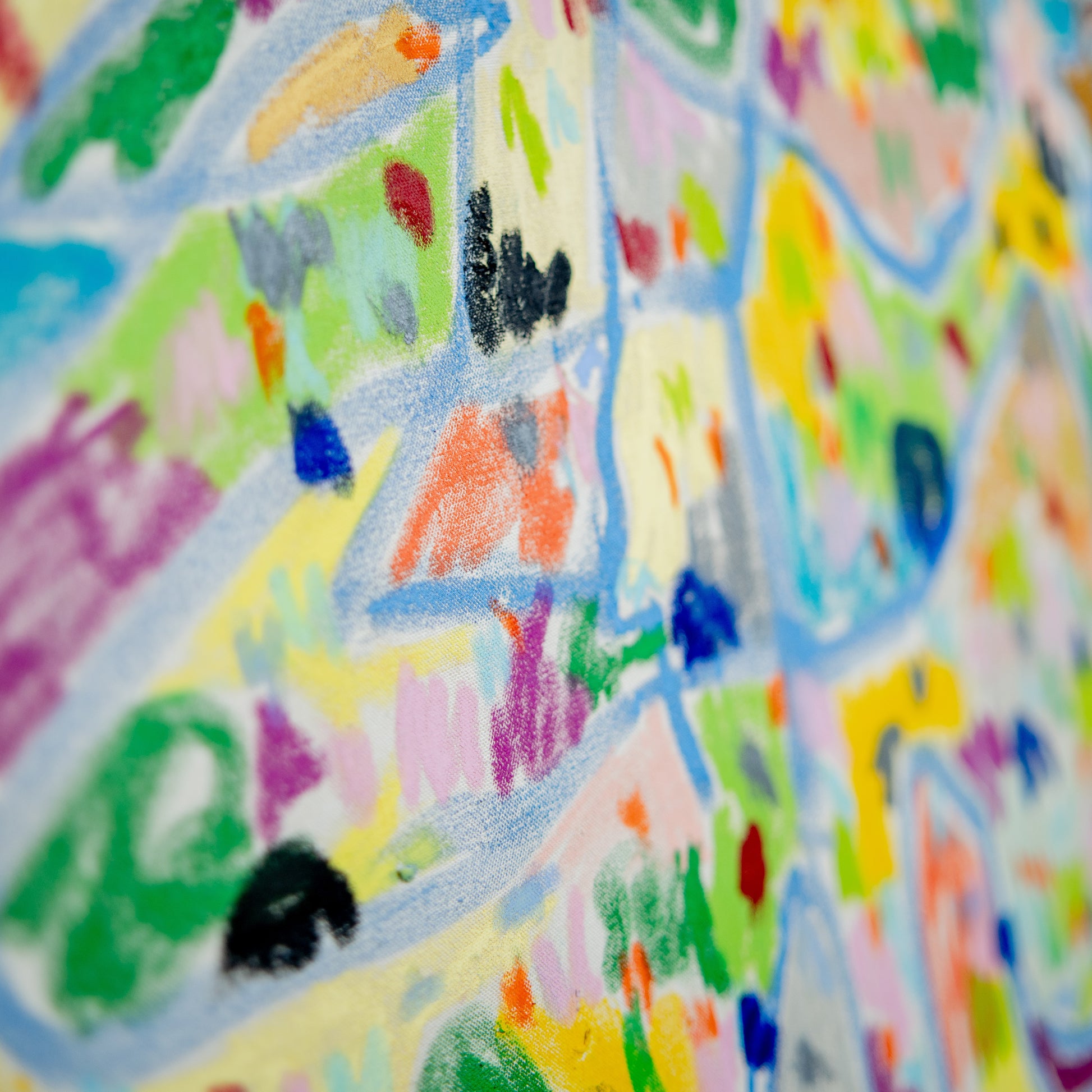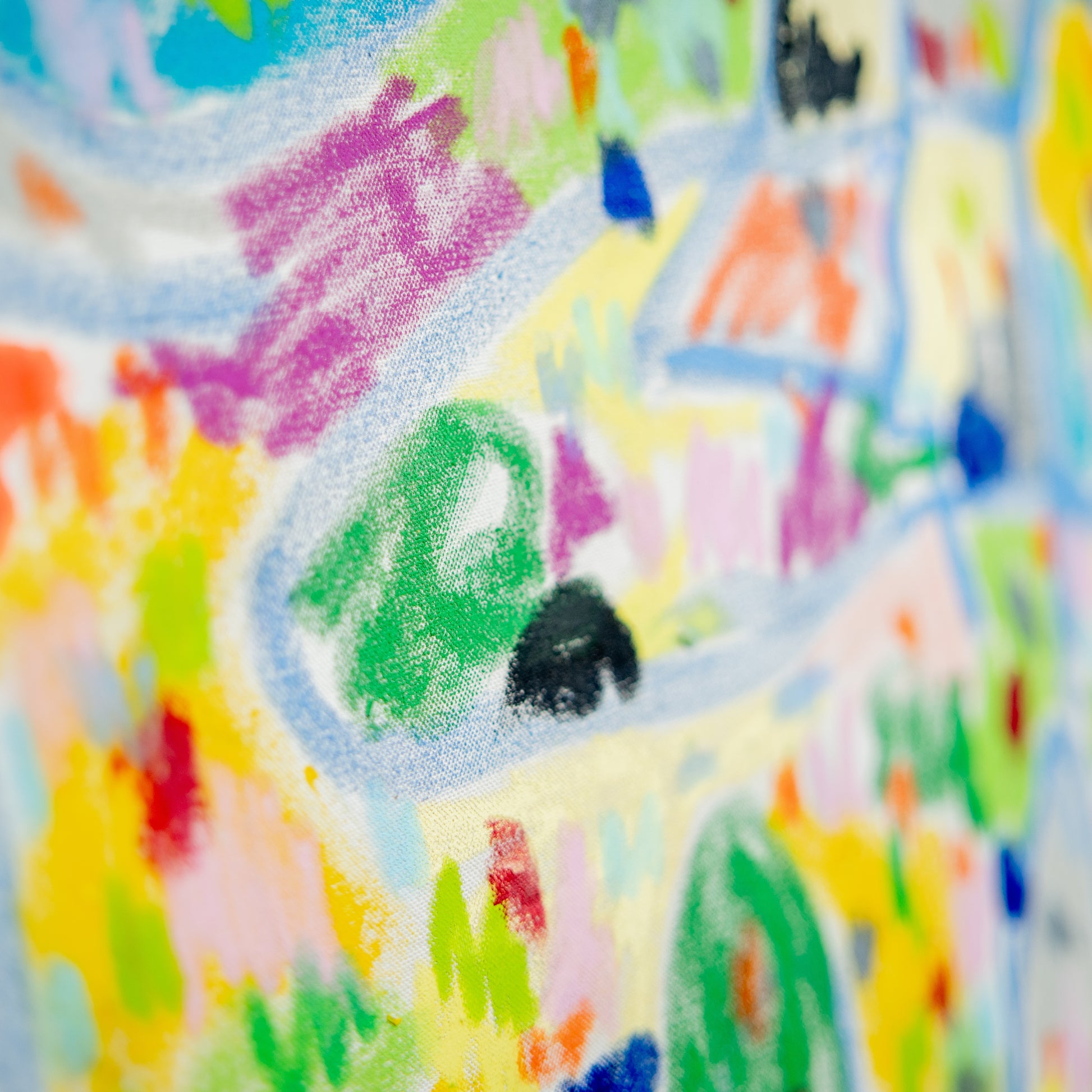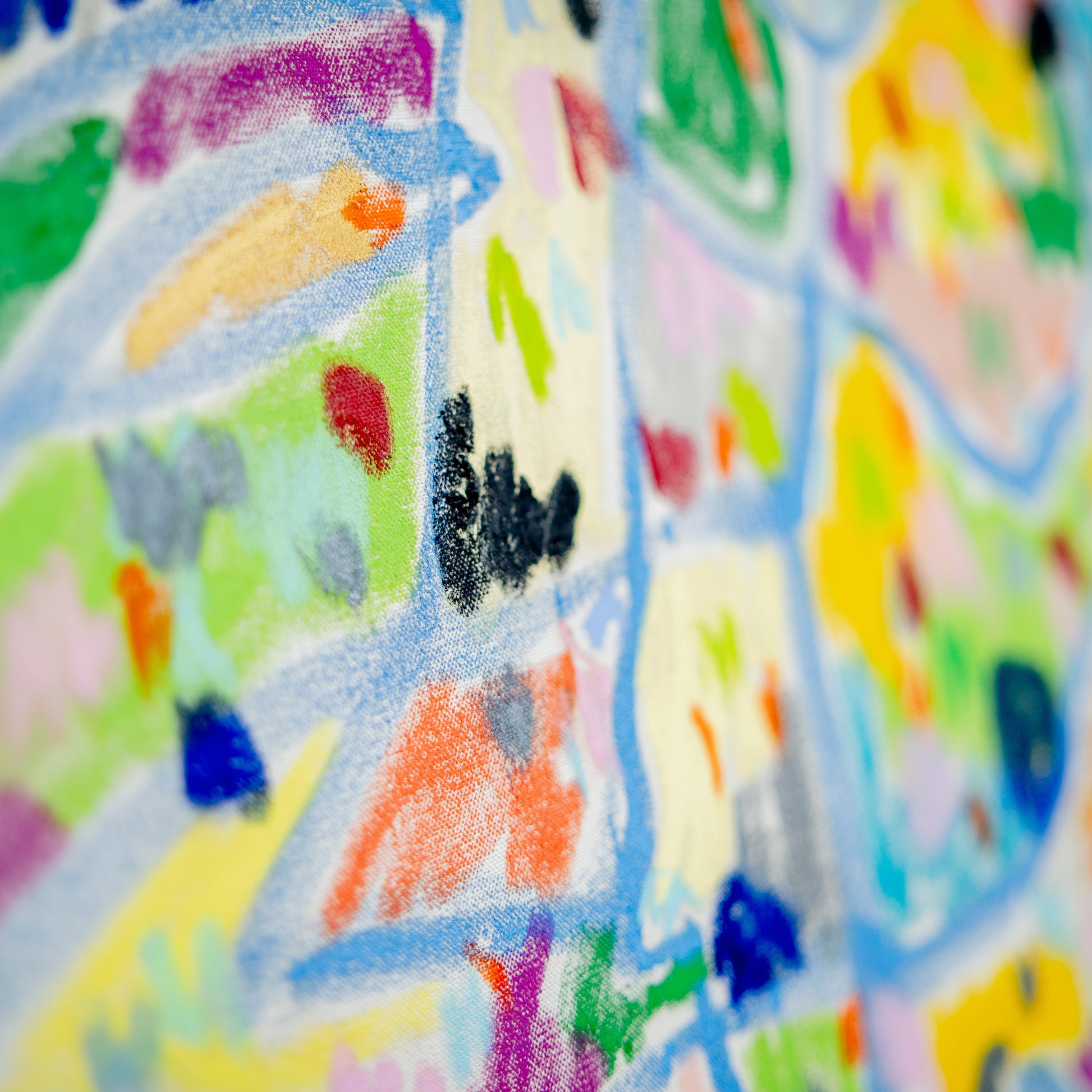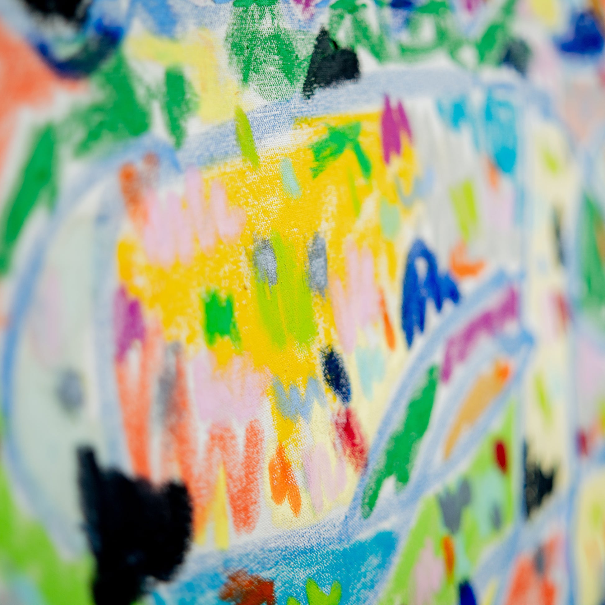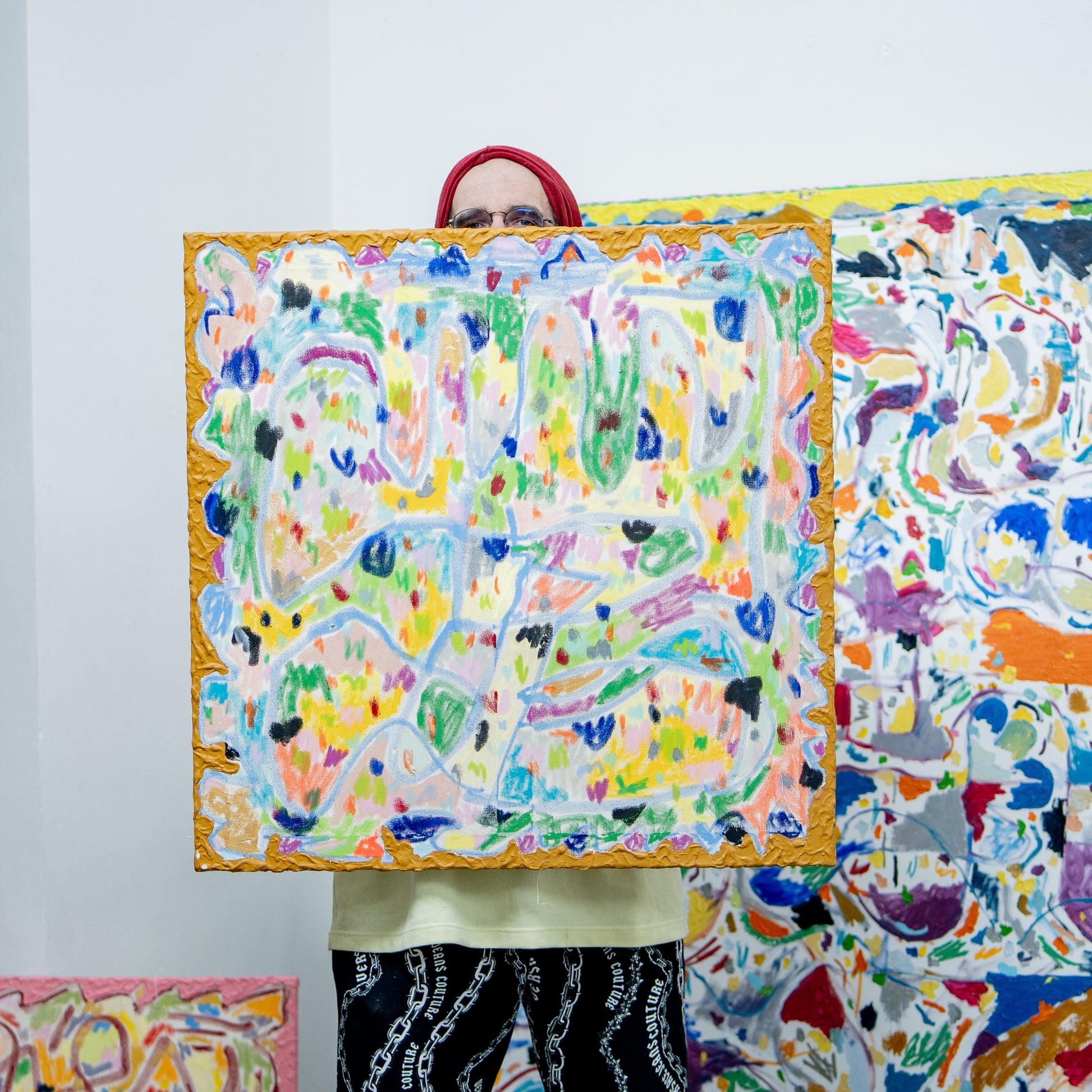 V Harmony No. 2 Julius Reichel sahá po lehčí, pastelové paletě a nechává kompozici fungovat jako spontánní proud znaků, stop a barevných nálad. Obraz působí volněji a hravěji než jeho ostřejší, graffiti laděné práce - jako barevný deník plný rytmu, drobných motivů a okamžitých impulsů. Rámování v kontrastní barvě dodává malbě další vrstvu energie a uzavírá celý výjev do optimistické, živé harmonie.