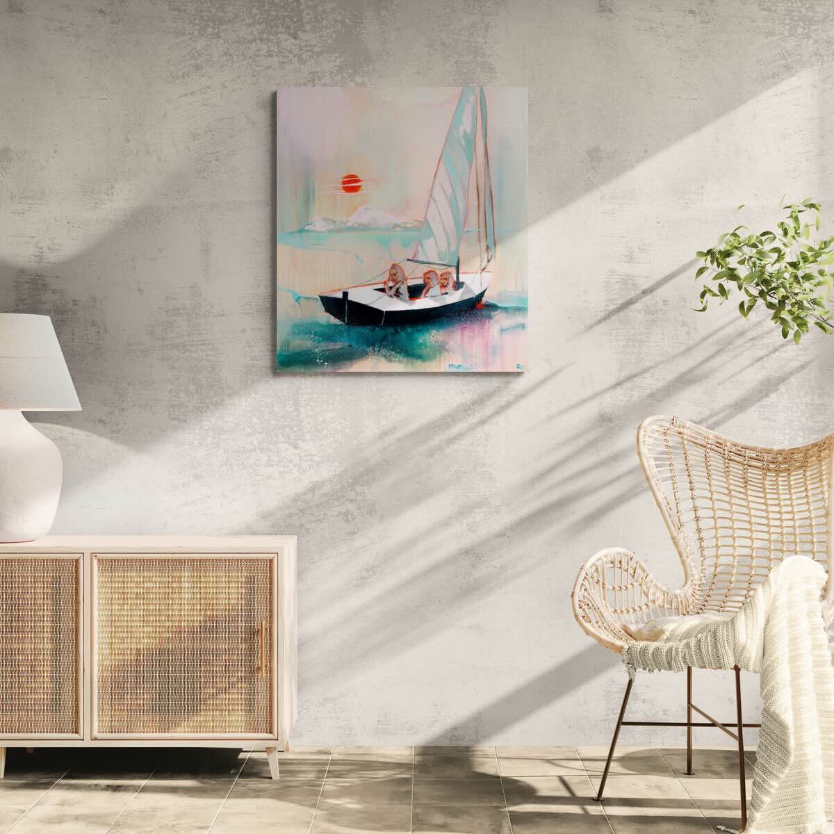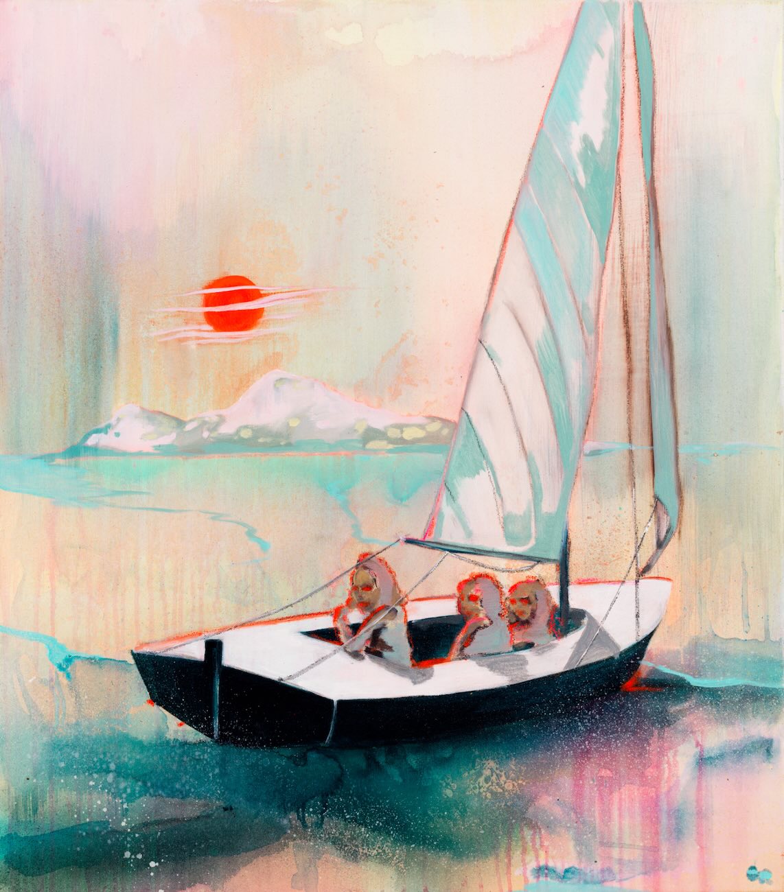 „Moon Call II“ Kristíny Mésároš navazuje na její dlouhodobý cyklus prací, v nichž hraje voda klíčovou roli – jako prostor paměti, introspekce i proměnlivé hranice mezi skutečností a snem. Stejně jako ve výstavách Voda medzi nami nebo Počiatok tu malířka propojuje figury a krajinu do imaginativní scény, která působí současně intimně i nadčasově. Loď s postavami na klidné hladině není jen obrazem plavby, ale i metaforou vnitřní cesty, zatímco měsíc nad horizontem funguje jako tichý signál, který zve k překročení známých břehů. Dílo tak zachycuje typickou Mésárošinu poezii - napětí mezi blízkostí a vzdáleností, mezi konkrétním okamžikem a univerzálním příběhem.