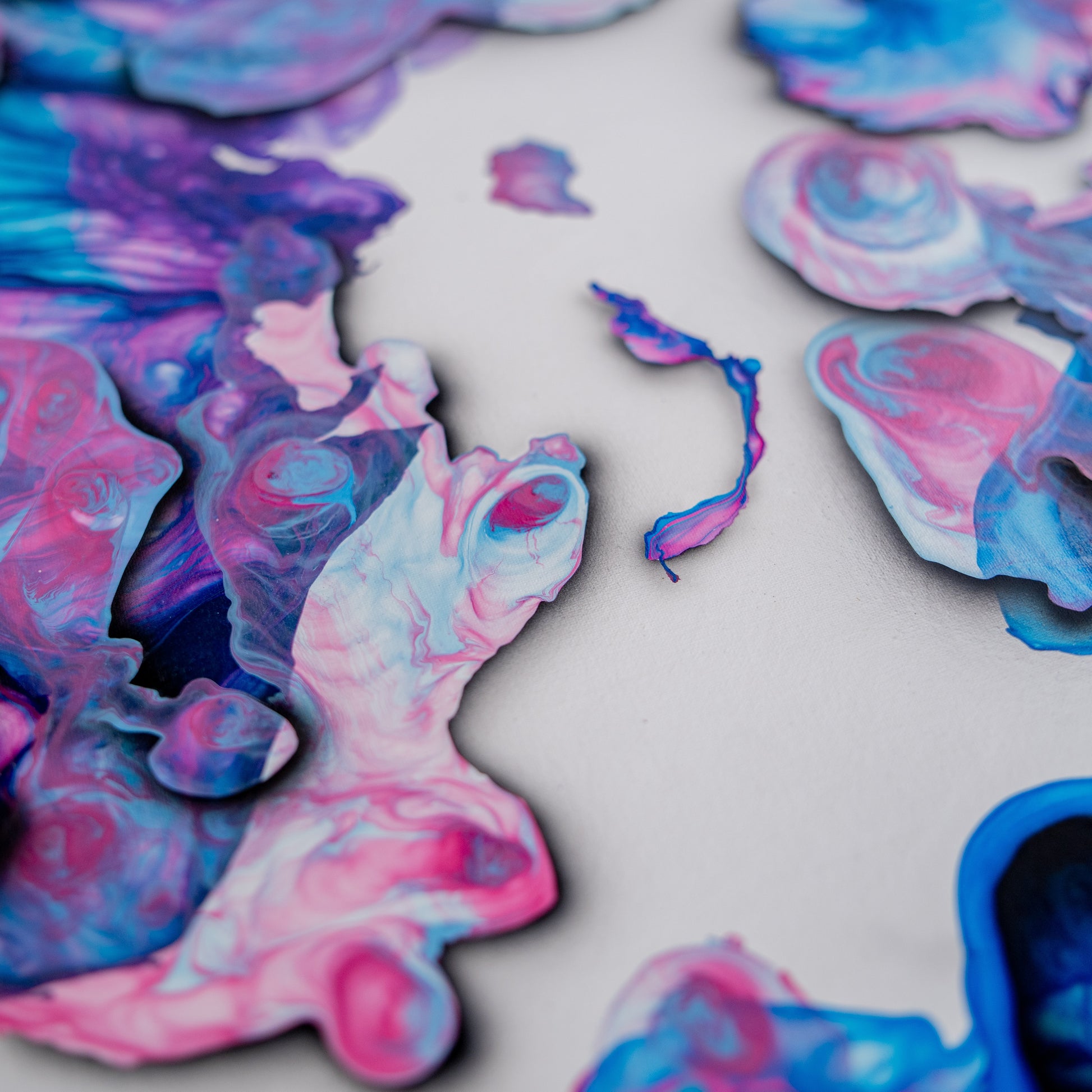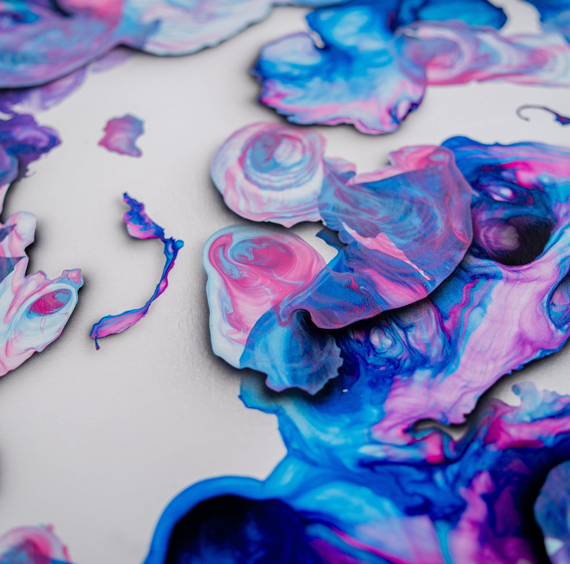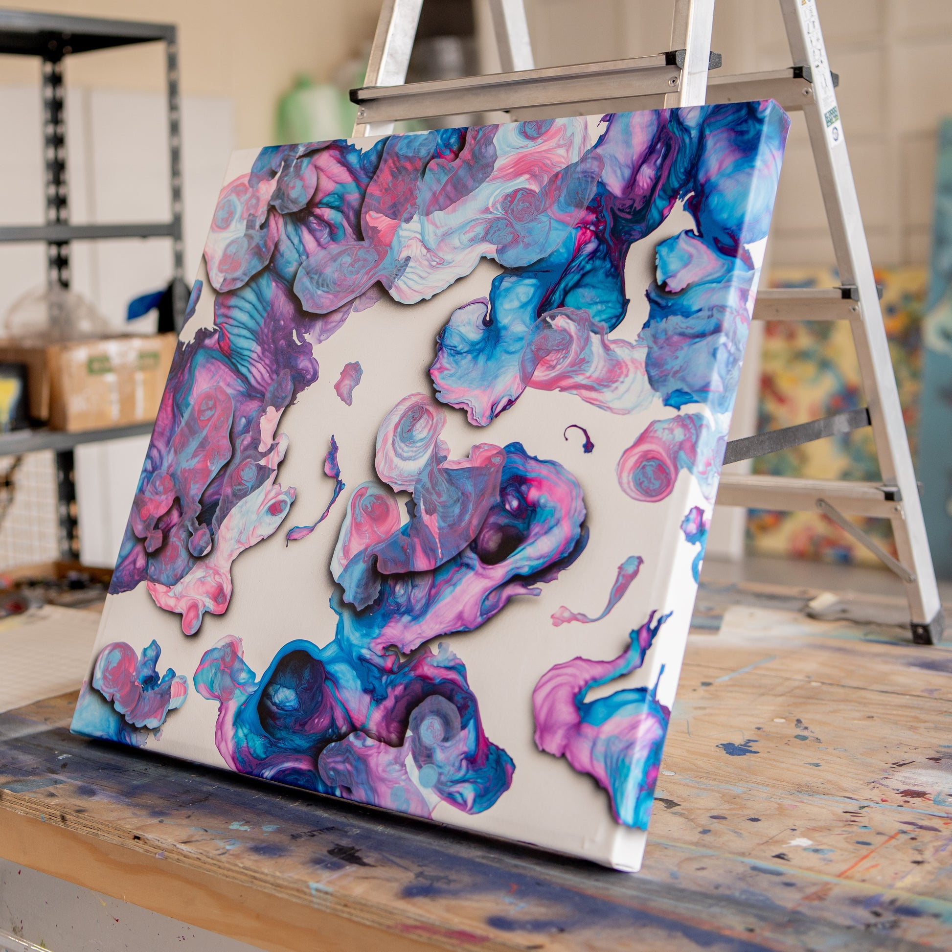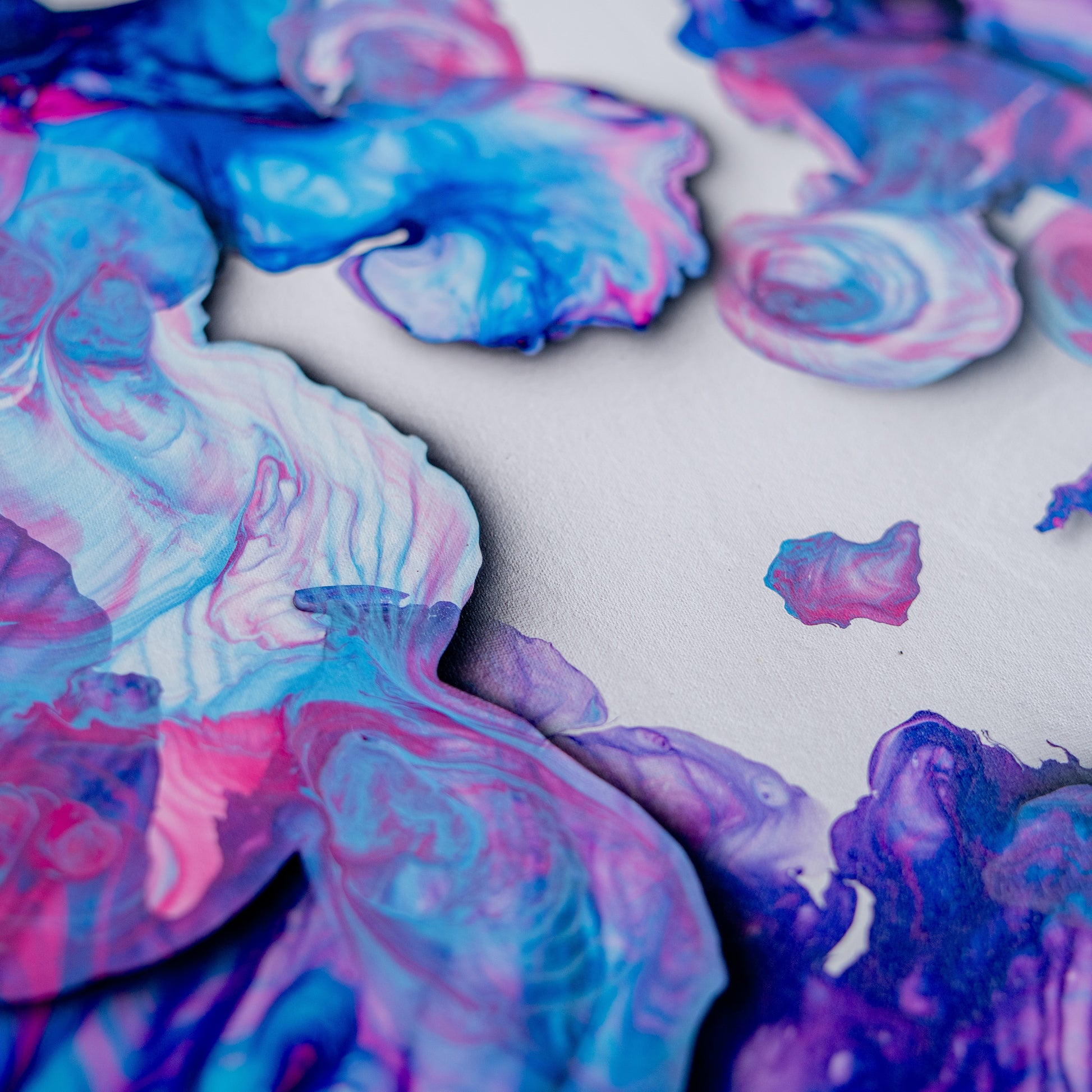 Jemným dechem pak barvy na hladině rozfoukáváme a vytváříme tak hypnotické přechody a organické vzory. Tento proces přináší do díla prvek náhody a současně dovoluje každému obrazu, aby si žil svou vlastní abstraktní kompozicí. Výsledkem jsou díla s proměnlivým obsahem, která se přizpůsobují divákovi vlastní imaginací a nabízejí každému jedinečný pohled.