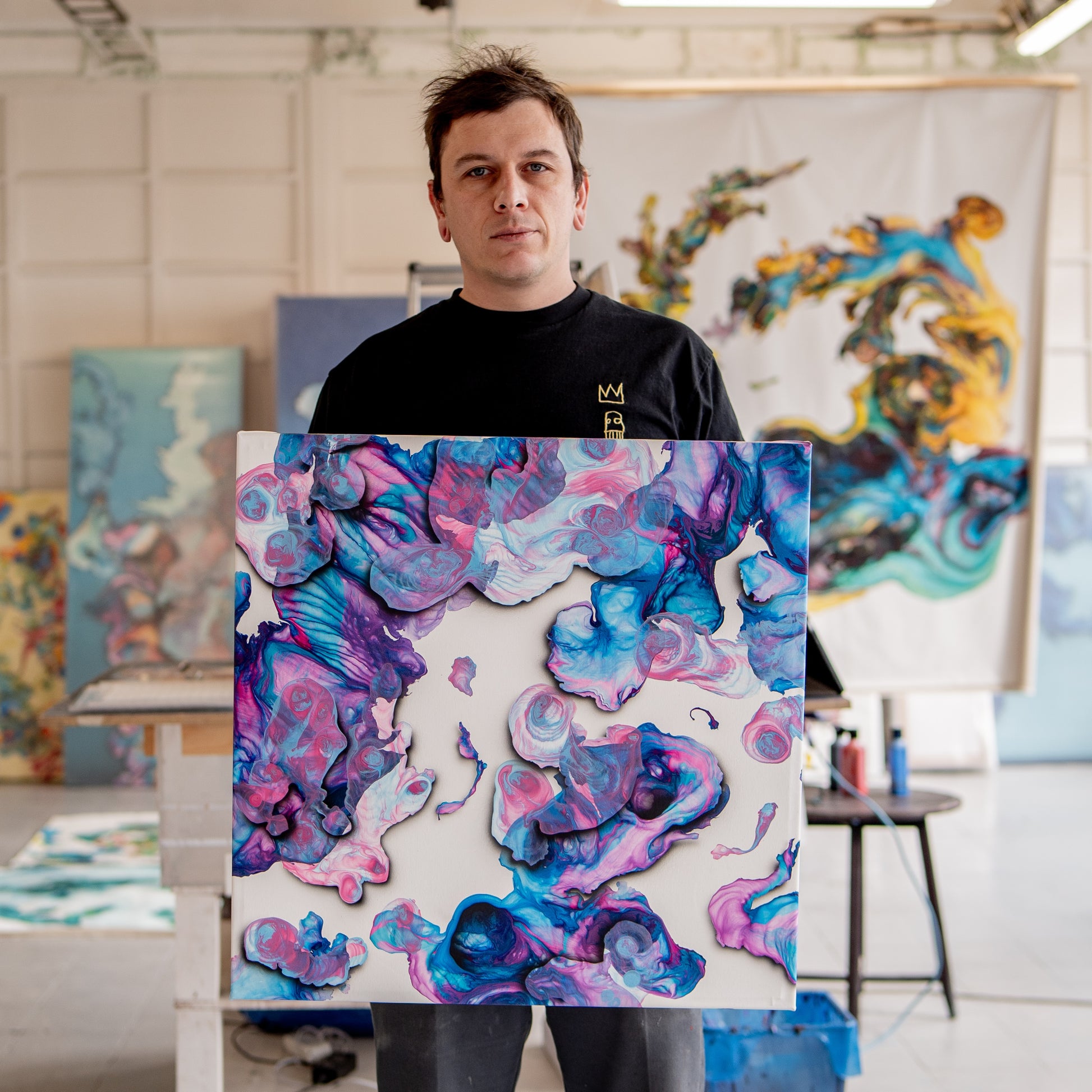 Ondrash & Kašpárek vytvářejí malby, ve kterých se barva sama stává hlavním aktérem – tekutá, vrstvená a neustále v pohybu. Tenhle obraz pracuje s chladnější paletou a jemně vířivými tvary, které připomínají proudění, vznikání a rozpouštění v jednom jediném barevném okamžiku.