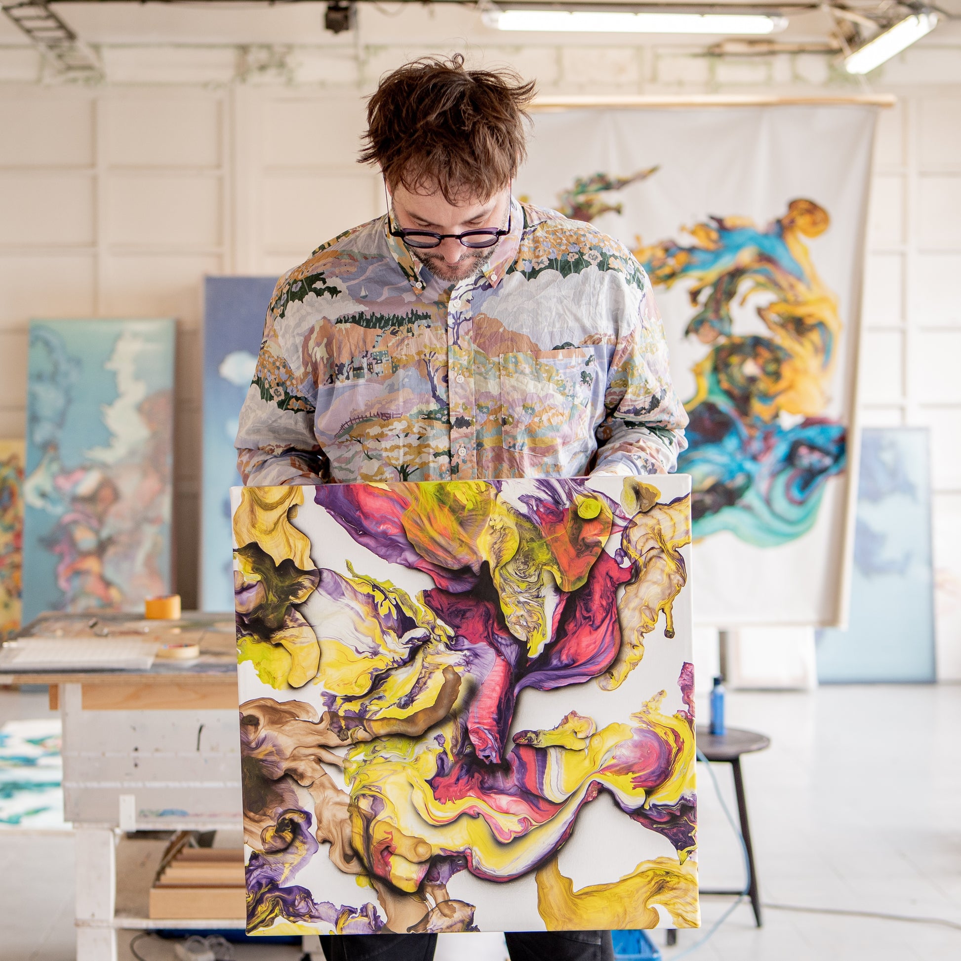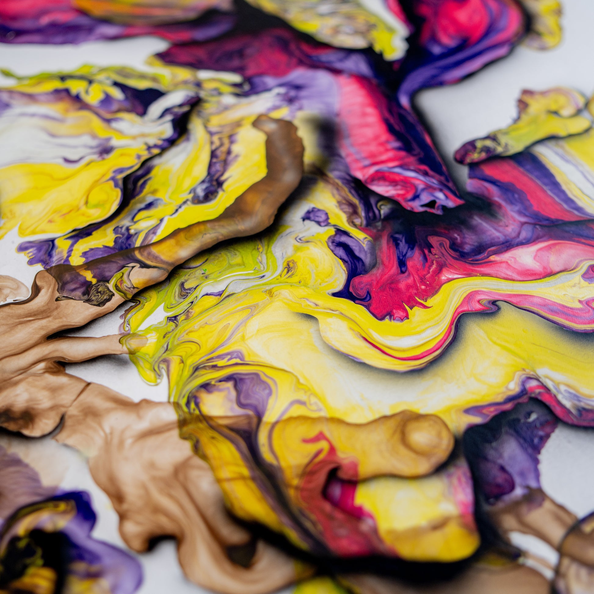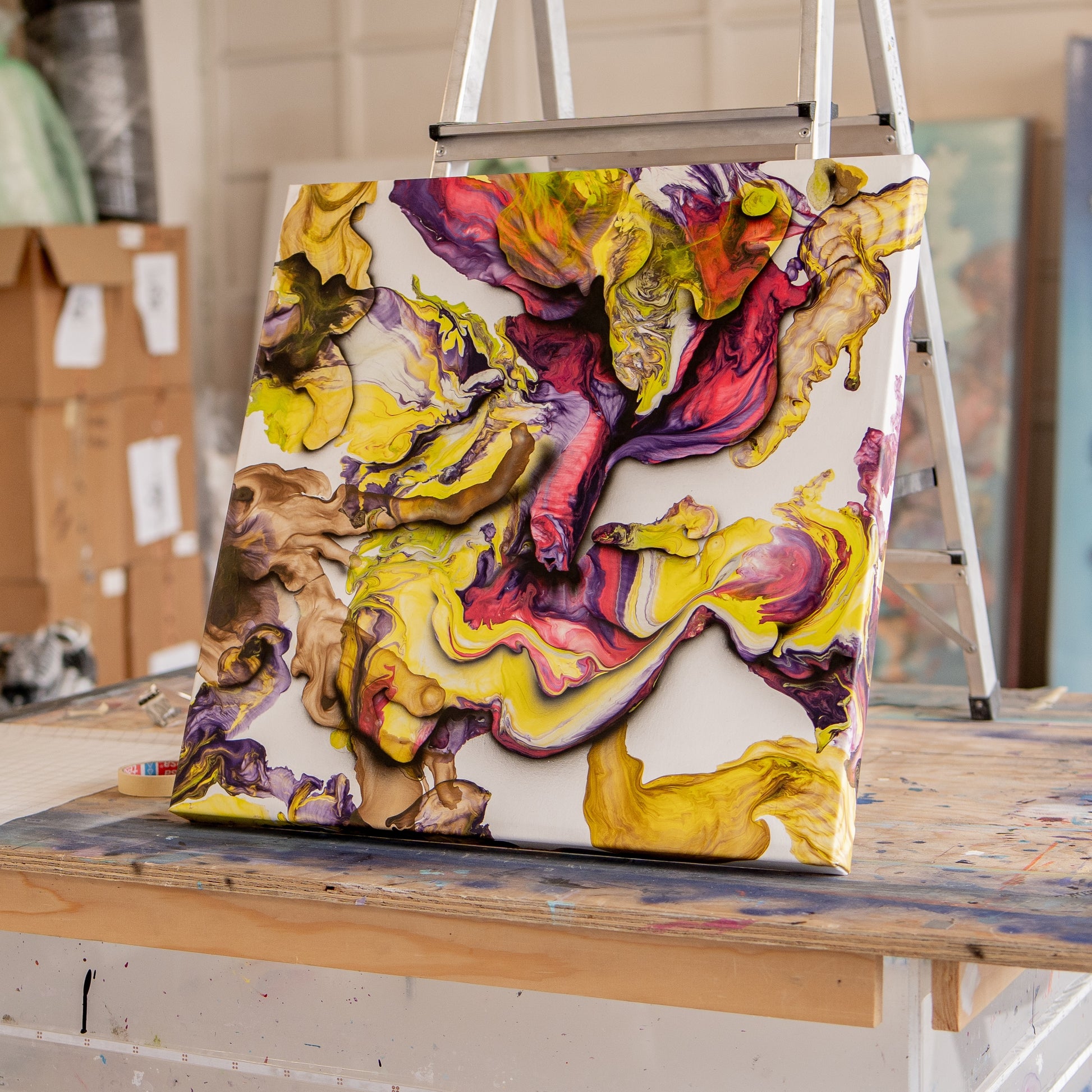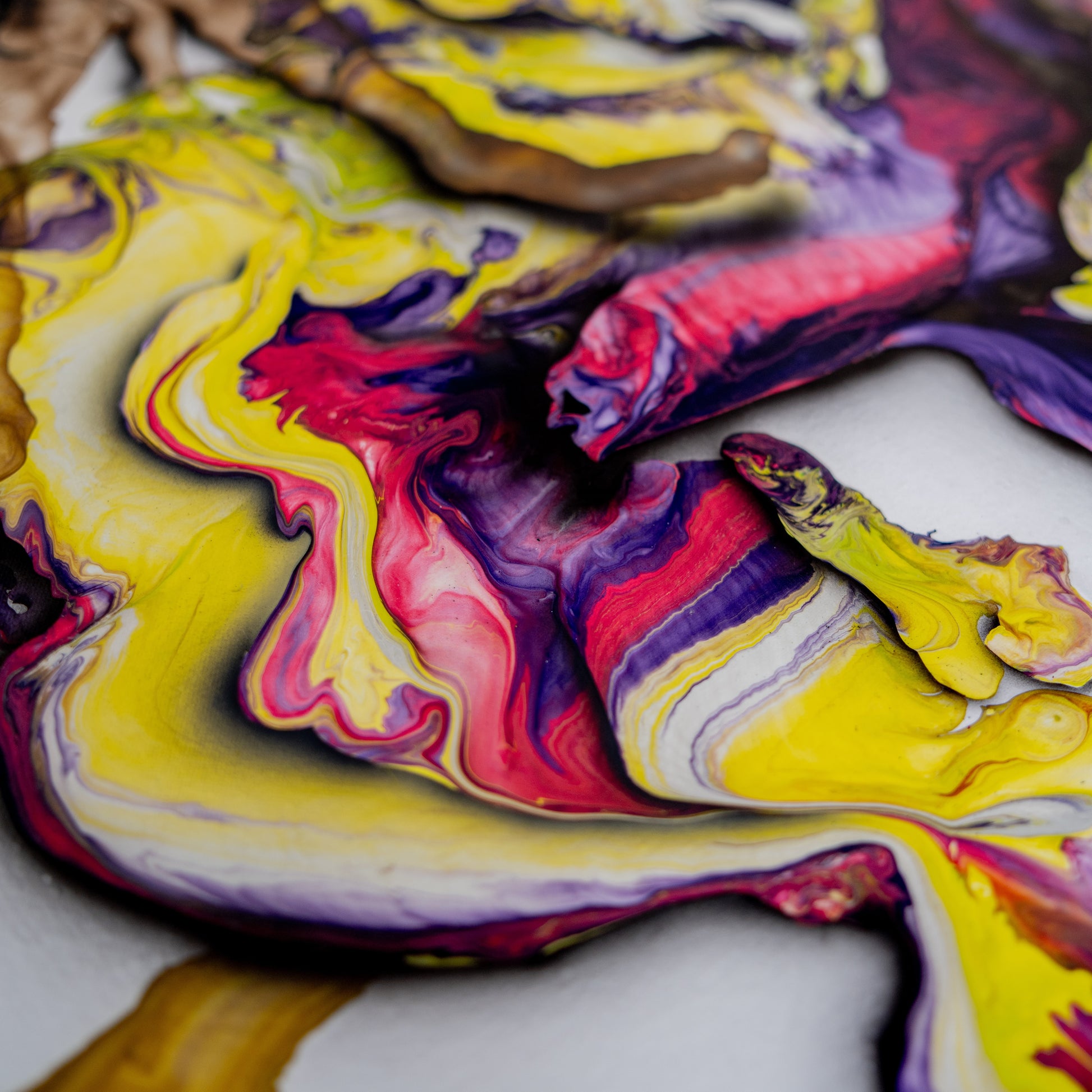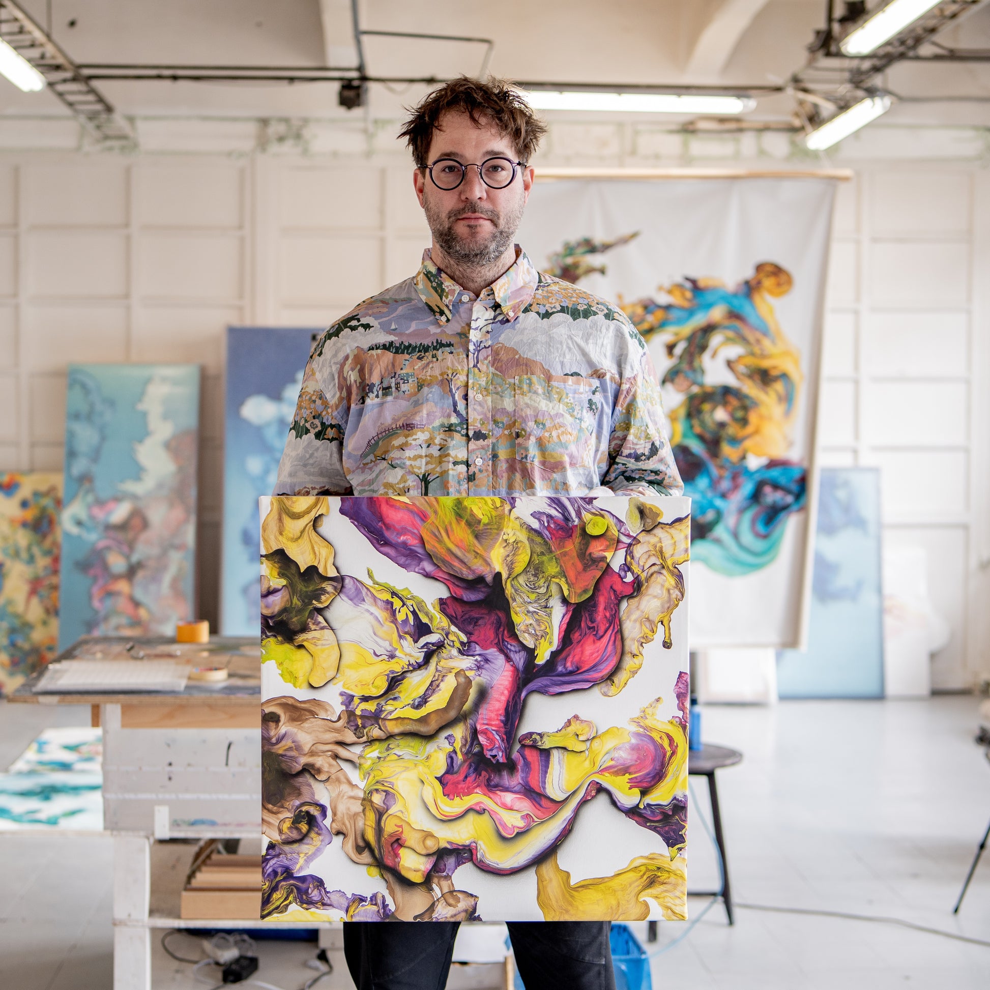 Ondrash & Kašpárek pracují s tekoucí barvou a proměňují ji v živé, organické tvary plné energie. Tenhle obraz je ukázkou jejich hravého rukopisu, kde se spontánní gesto mění v barevně intenzivní, harmonickou kompozici.