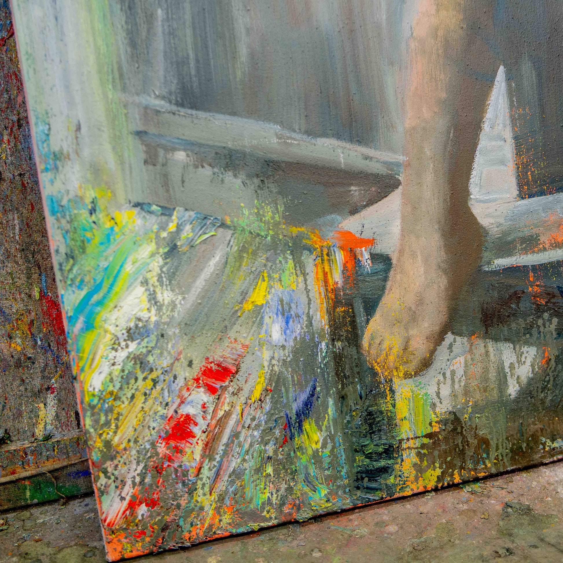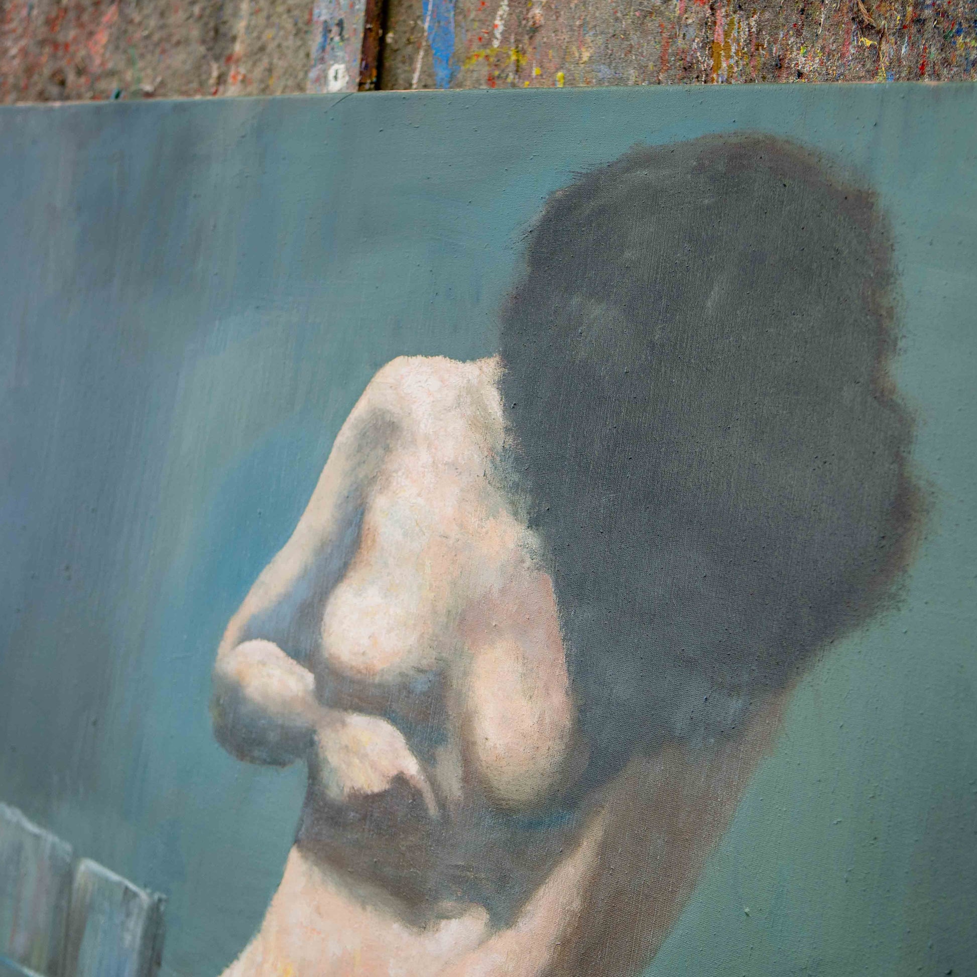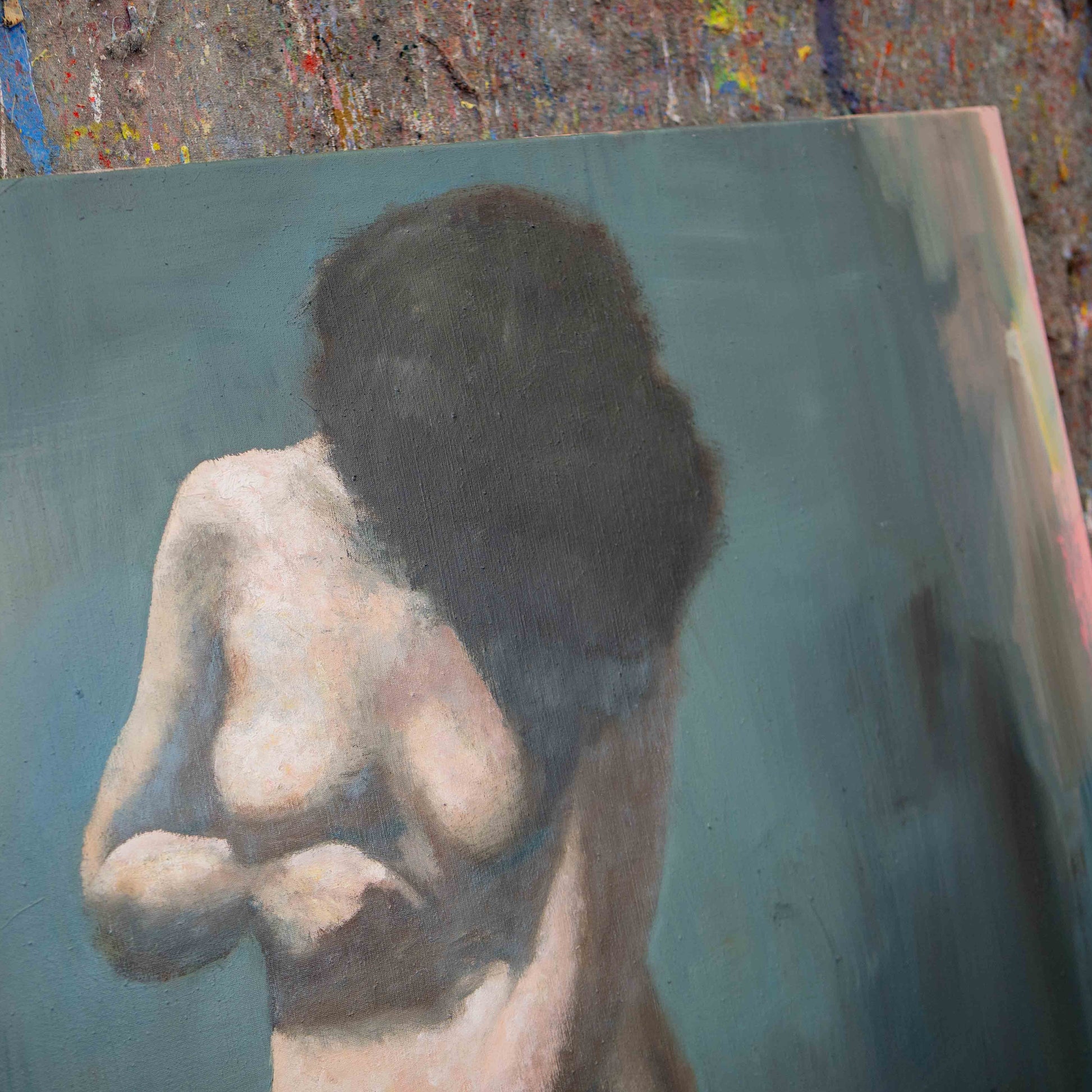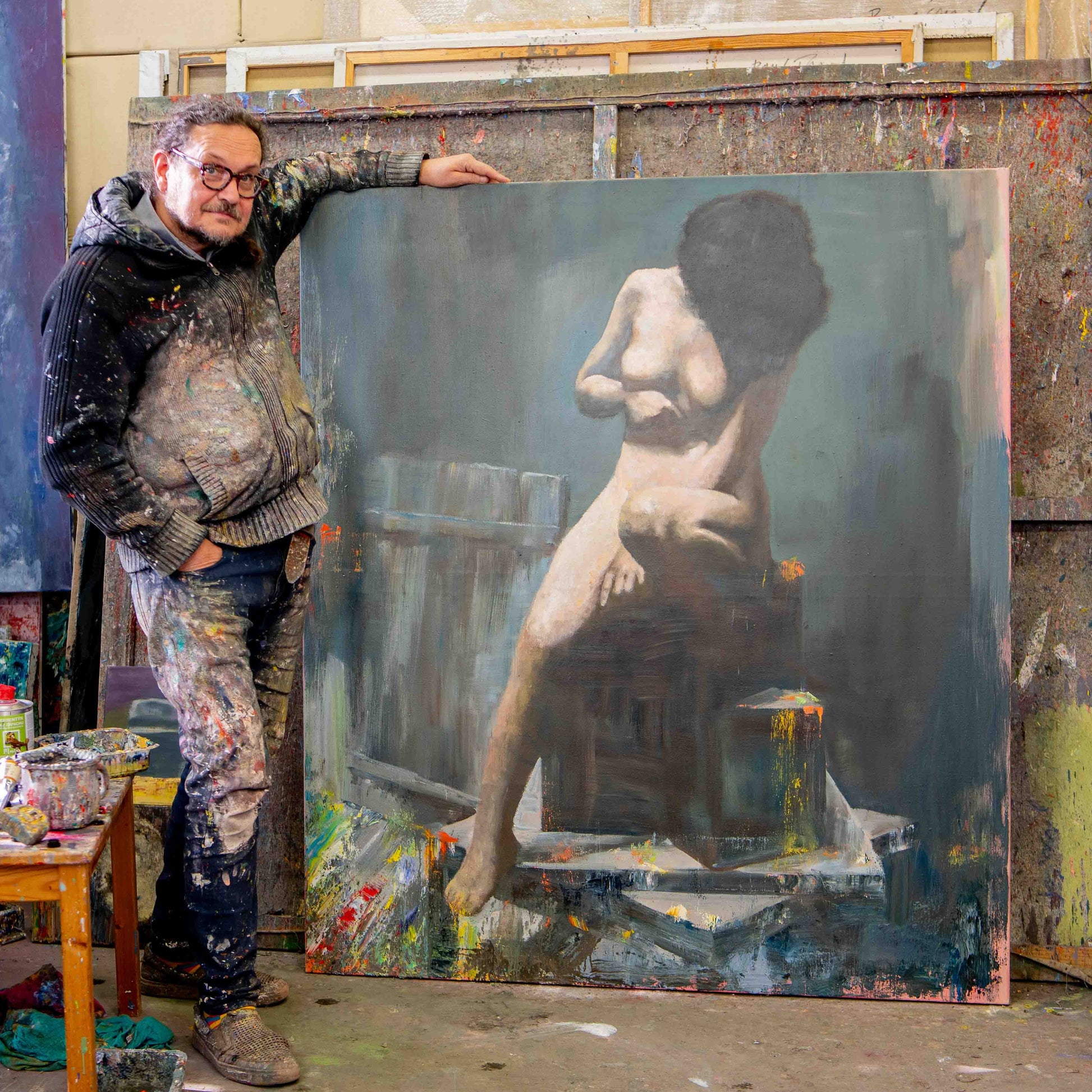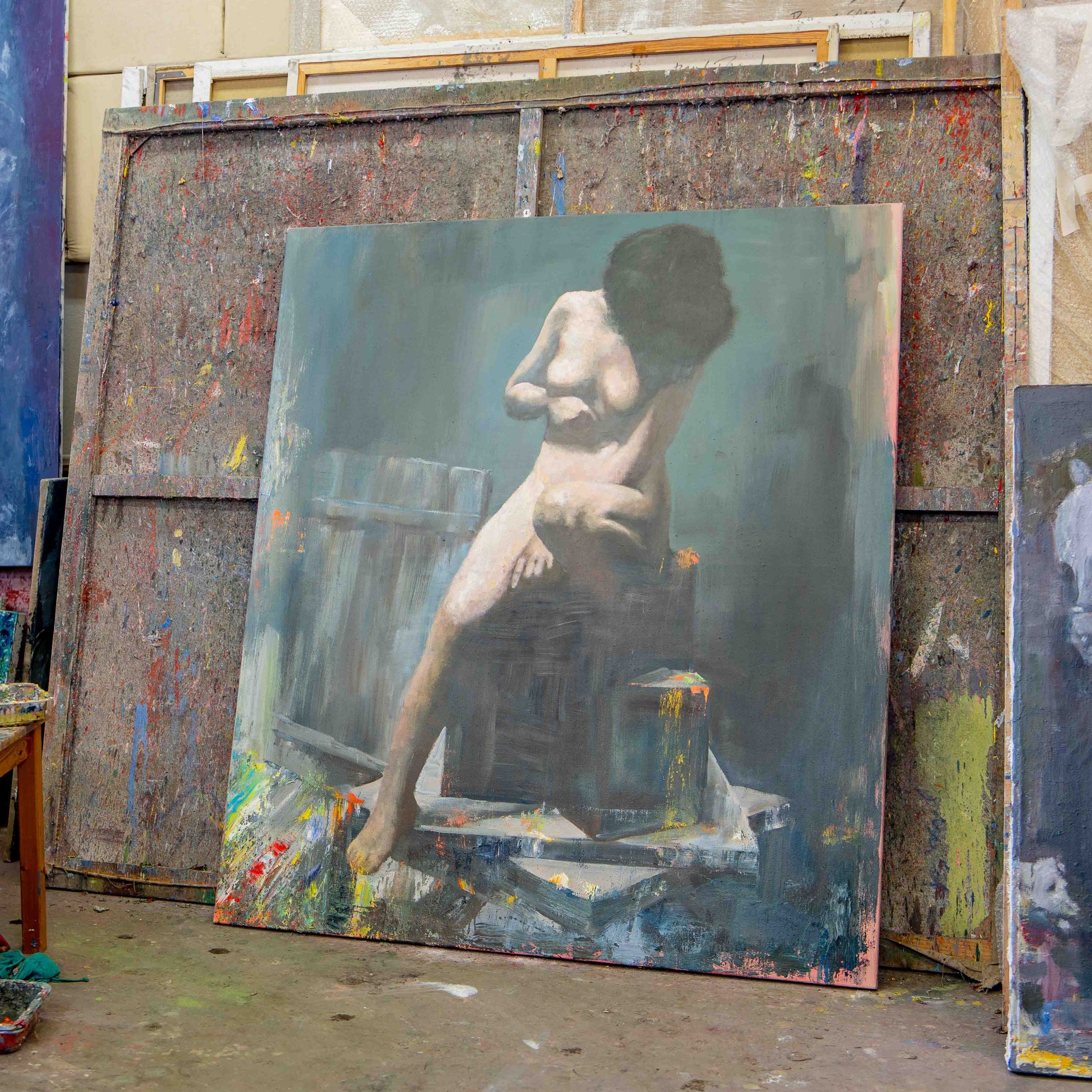 Ve Francouzce Pavel Šmíd ukazuje svou schopnost zachytit figuru nejen malířsky přesvědčivě, ale i lidsky křehce. Nahá postava sedící v ateliéru působí klidně a přirozeně, jako by byla součástí místa, kde vzniká. Tlumená barevnost, měkké světlo a jemná práce s tělesností vytvářejí atmosféru tiché intimity, která Šmídovým figurám tak dobře sedí.