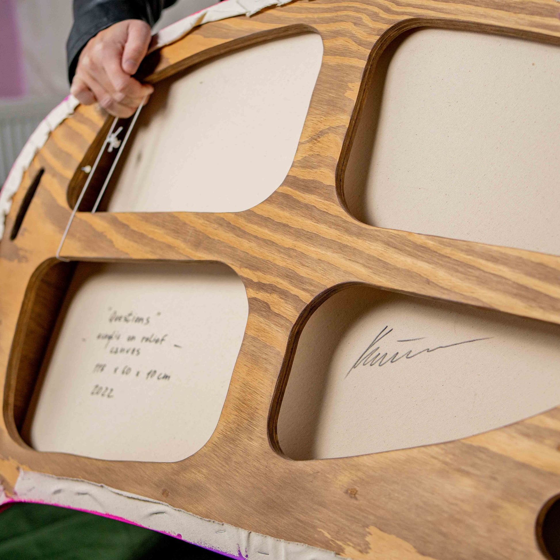Akrylový obraz napnutý na reliéfním rámu pracuje s napětím mezi tvarem a světlem. Vrstvené barevné přechody vytvářejí iluzi pohybu, která narušuje statičnost formy a otevírá prostor pro vnímání hloubky.