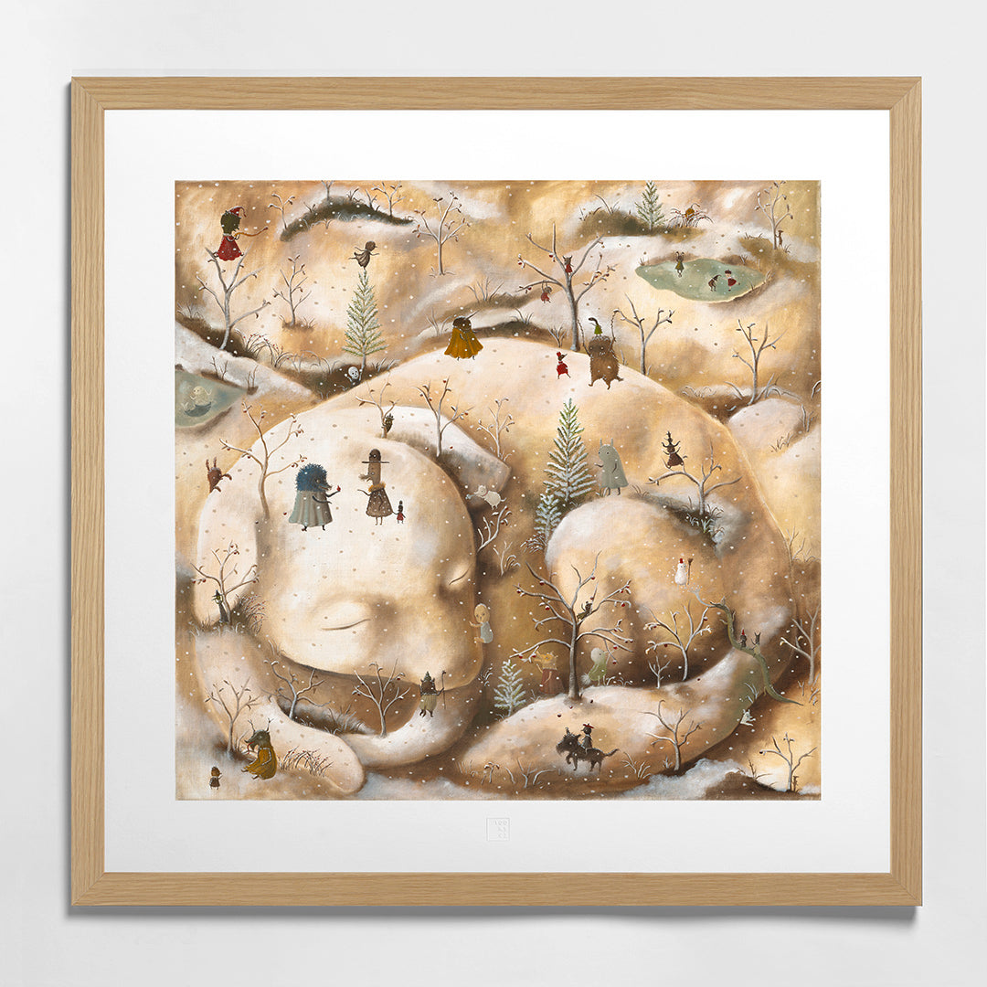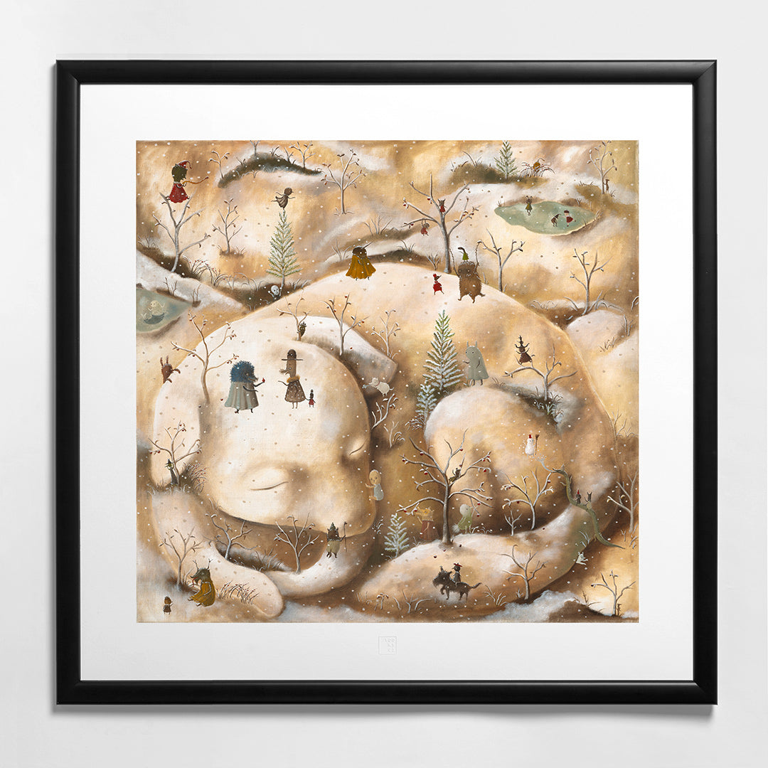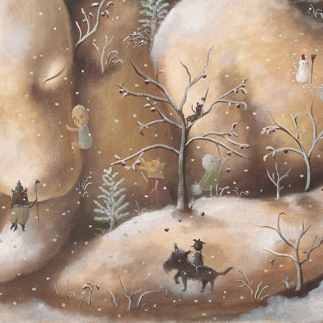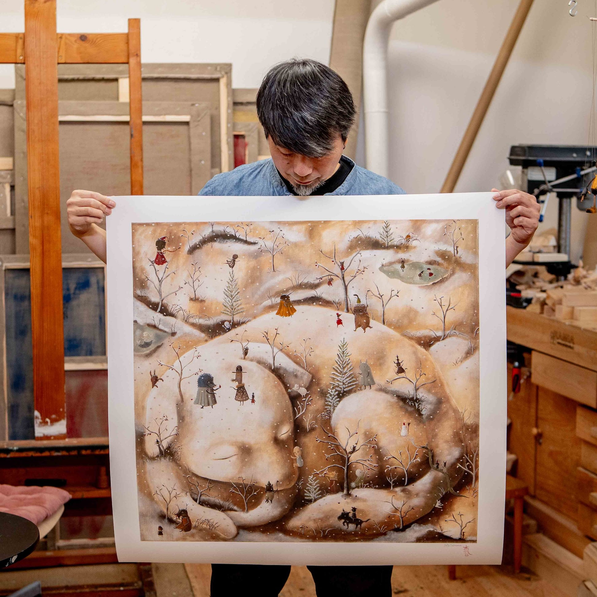Pro 100ks jsme od Soty Sakumy vybrali dílo nazvané Velký spáč. Inspirací pro tento nekonečně jemný obraz byl pohled na zasněženou krajinu, která by se mohla nacházet jak v Japonsku, tak v Česku. Sakuma si zachoval dětskou schopnost vnímat, jak se přírodní útvary při troše fantazie formují do tvarů připomínajících zvířecí nebo lidské rysy. Místo zasněžených kopců tu máme spícího psa, na jehož hřbetu se odehrávají další vrstvy příběhu - roztodivné bytůstky tu bruslí po ledu, tančí ve špičkách stromů, koulují se a plnými doušky hltají ten zimní čas, který jen zdánlivě a na první pohled může vypadat, že příroda a všechno s ní spojené spí.