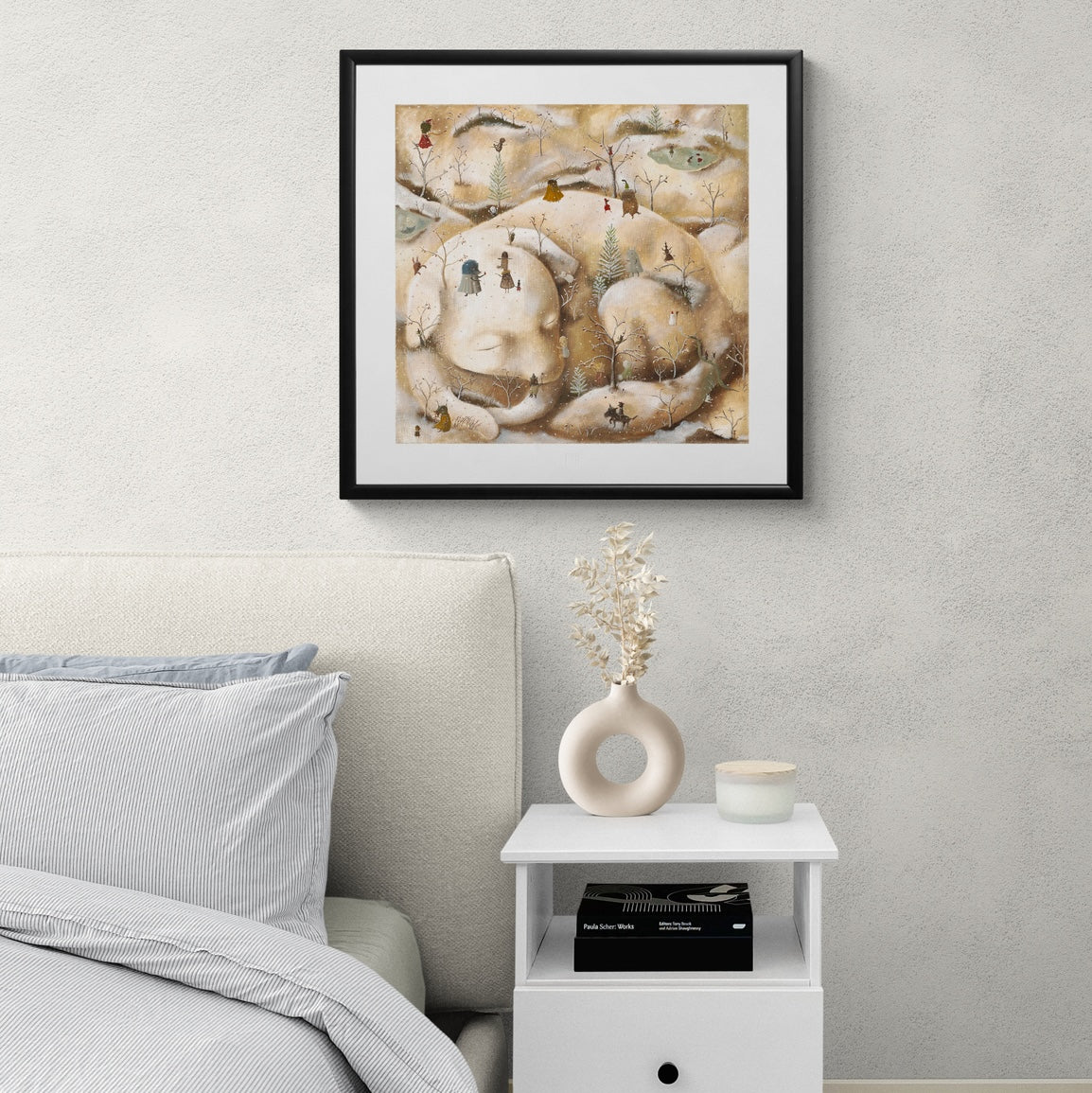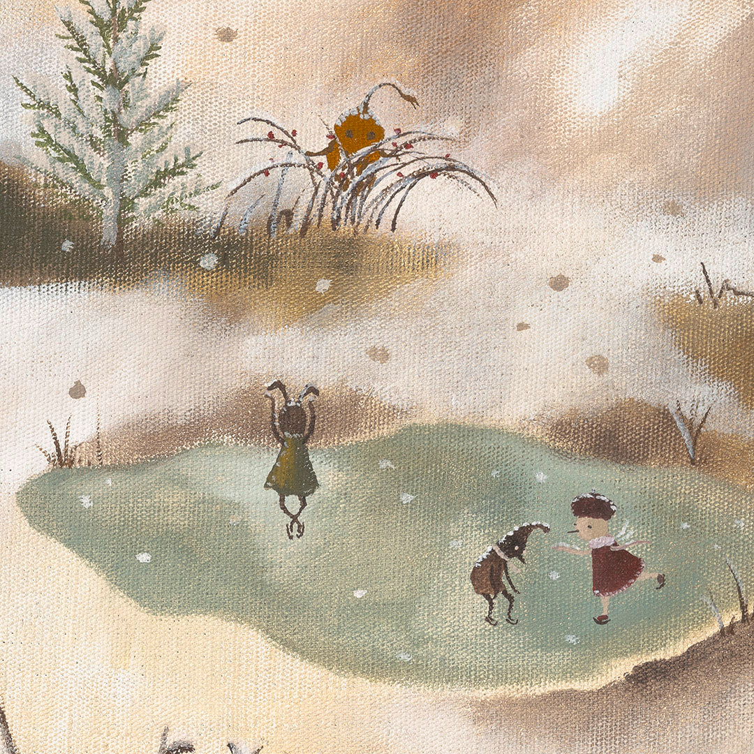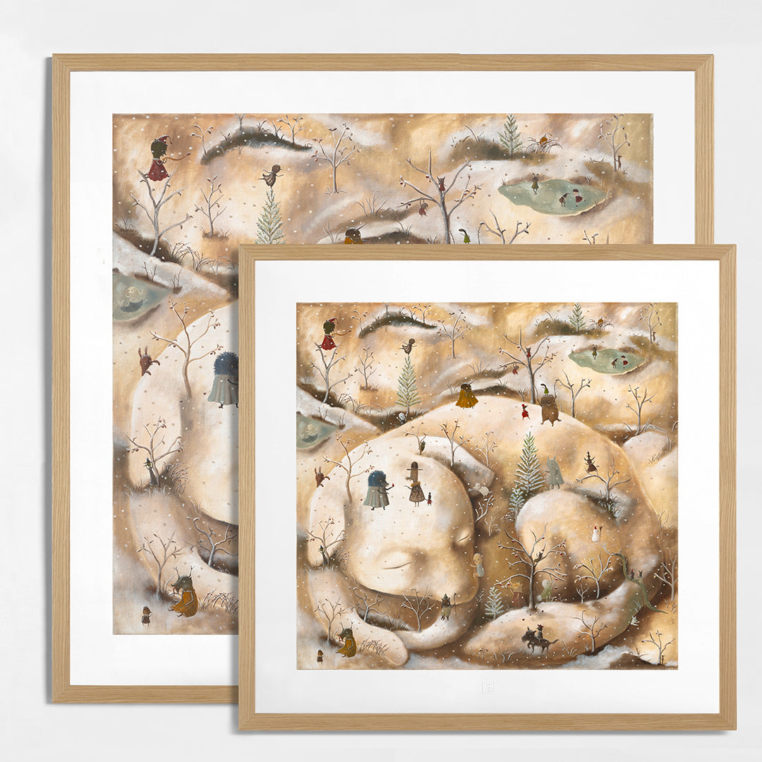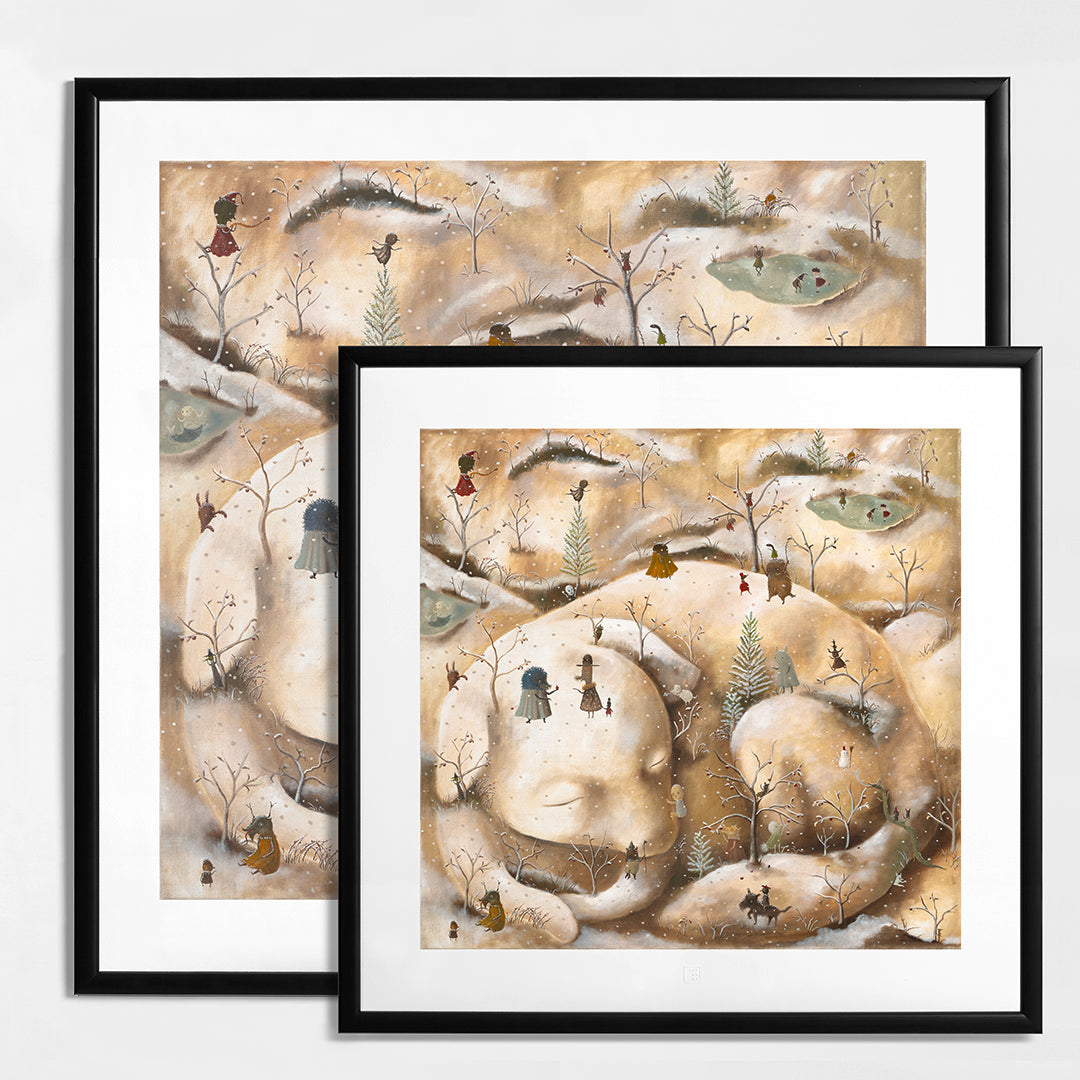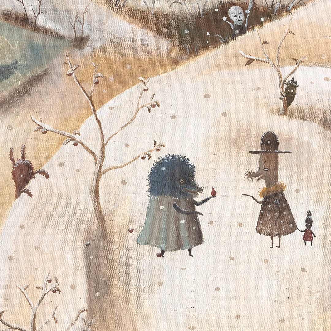 Pro 100ks jsme od Soty Sakumy vybrali dílo nazvané Velký spáč. Inspirací pro tento nekonečně jemný obraz byl pohled na zasněženou krajinu, která by se mohla nacházet jak v Japonsku, tak v Česku. Sakuma si zachoval dětskou schopnost vnímat, jak se přírodní útvary při troše fantazie formují do tvarů připomínajících zvířecí nebo lidské rysy. Místo zasněžených kopců tu máme spícího psa, na jehož hřbetu se odehrávají další vrstvy příběhu - roztodivné bytůstky tu bruslí po ledu, tančí ve špičkách stromů, koulují se a plnými doušky hltají ten zimní čas, který jen zdánlivě a na první pohled může vypadat, že příroda a všechno s ní spojené spí.
