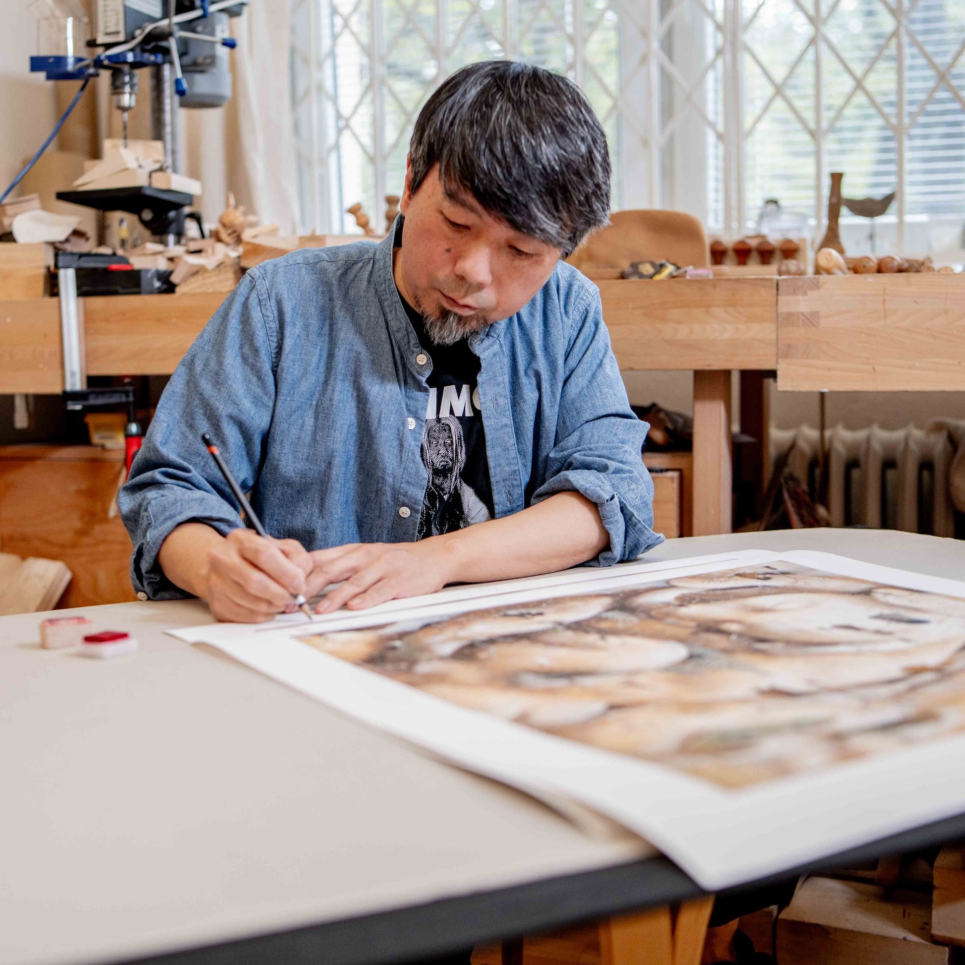 Sota Sakuma je původem japonský malíř, kreslíř a loutkař, žijící už od roku 2000 v Praze. Jeho fantaskní tvorba je plná divotvorných postaviček na pomezí světa zvířat, duchů přírody a pohádkových postav. Často se objevují jako miniaturní bytůstky doslova obsypávající krajinu nebo domácí prostory, jindy je pozorujeme víc zblízka, v jemných detailech vykreslujících jejich roztomilé i trochu strašidelné rysy.