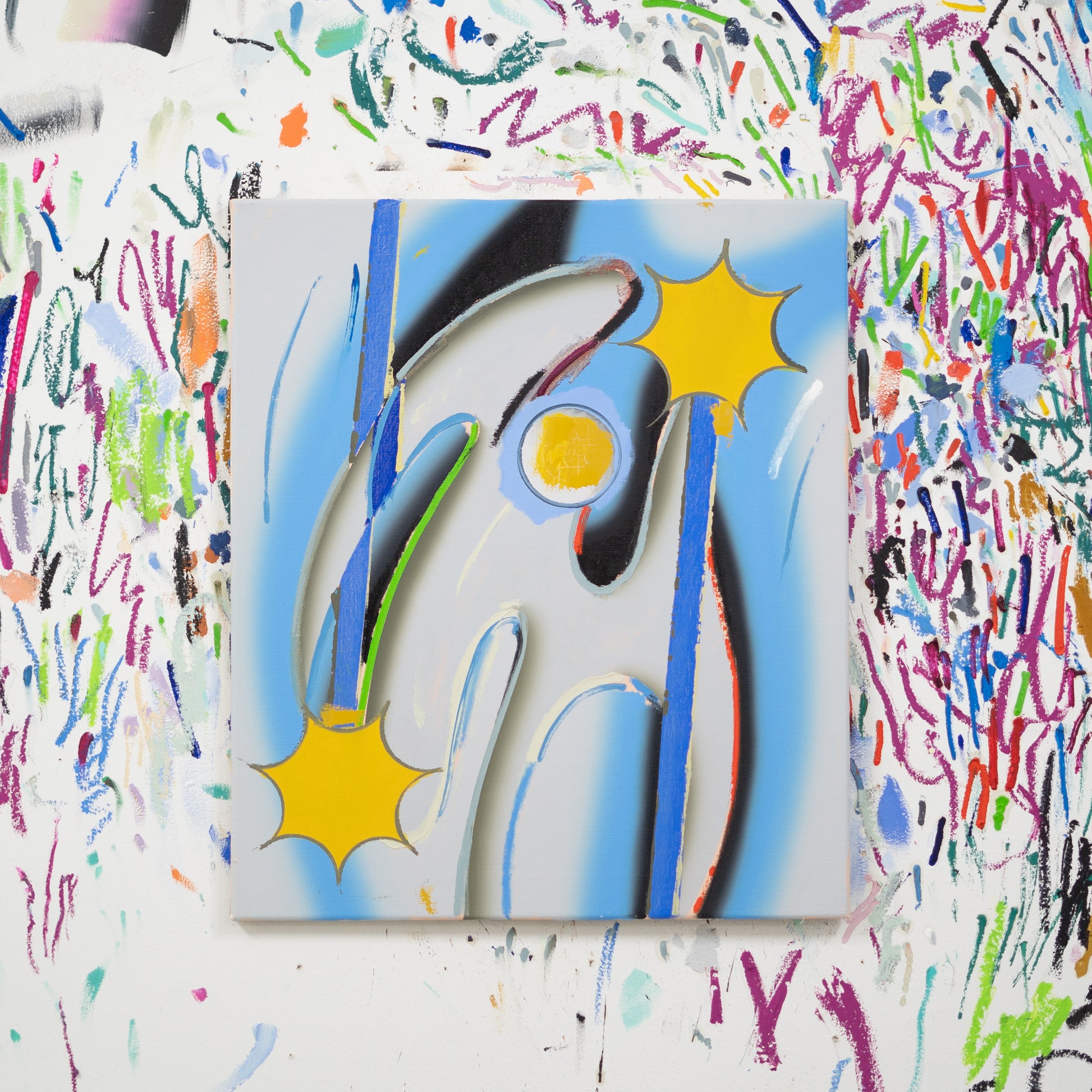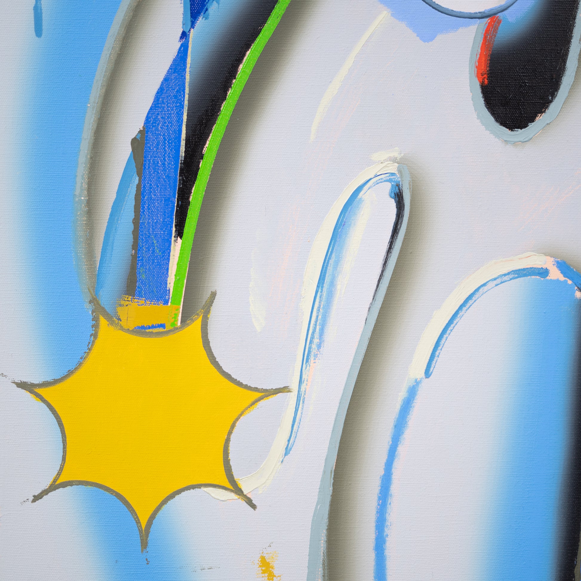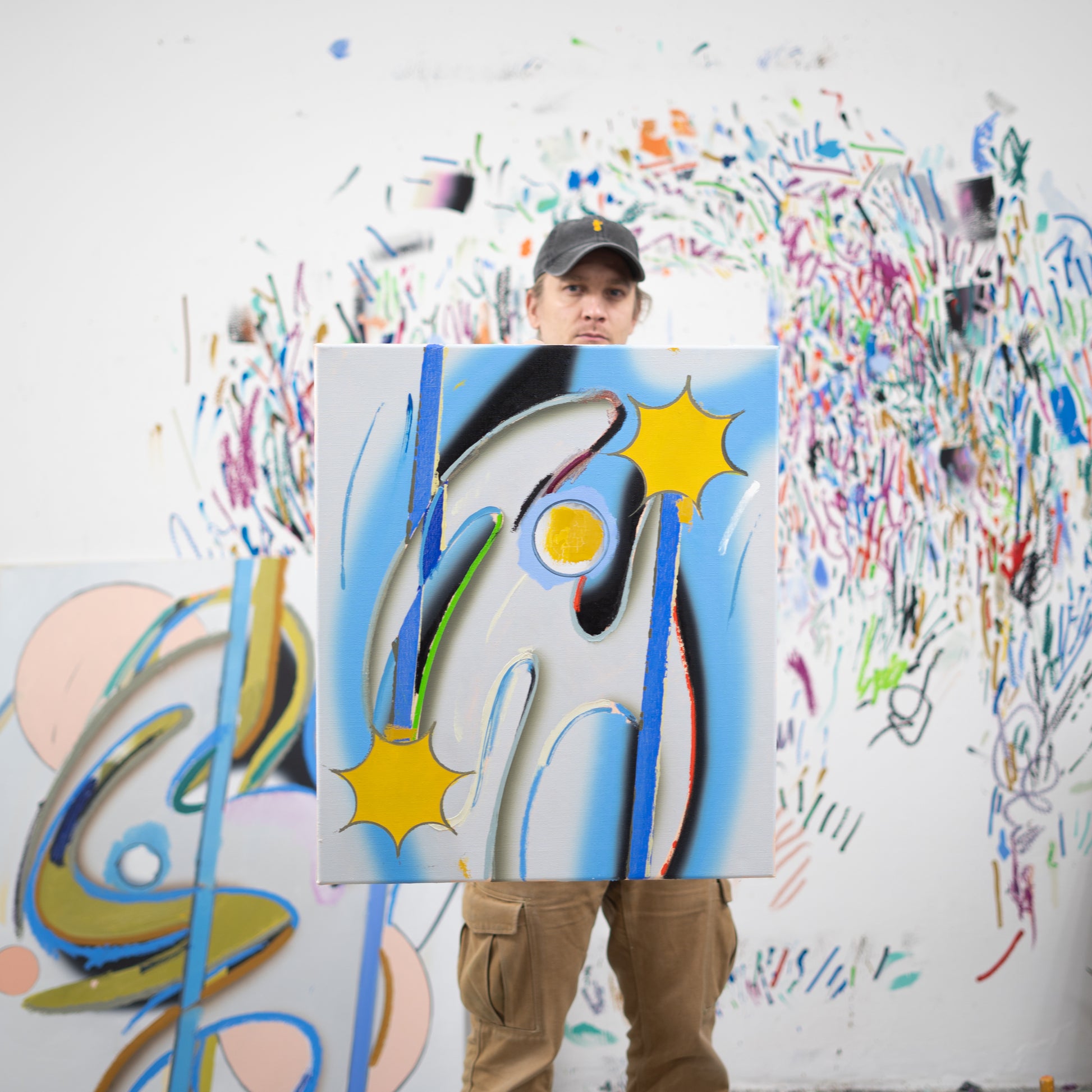 Osobitý malíř s výrazným rukopisem a obraz, který vychází z autorovy dlouhodobé série pracující s infografickou stylizací postavy. Kompozice odhaluje vnitřní konstrukci obrazu a nabízí pohled skrz jeho strukturu.