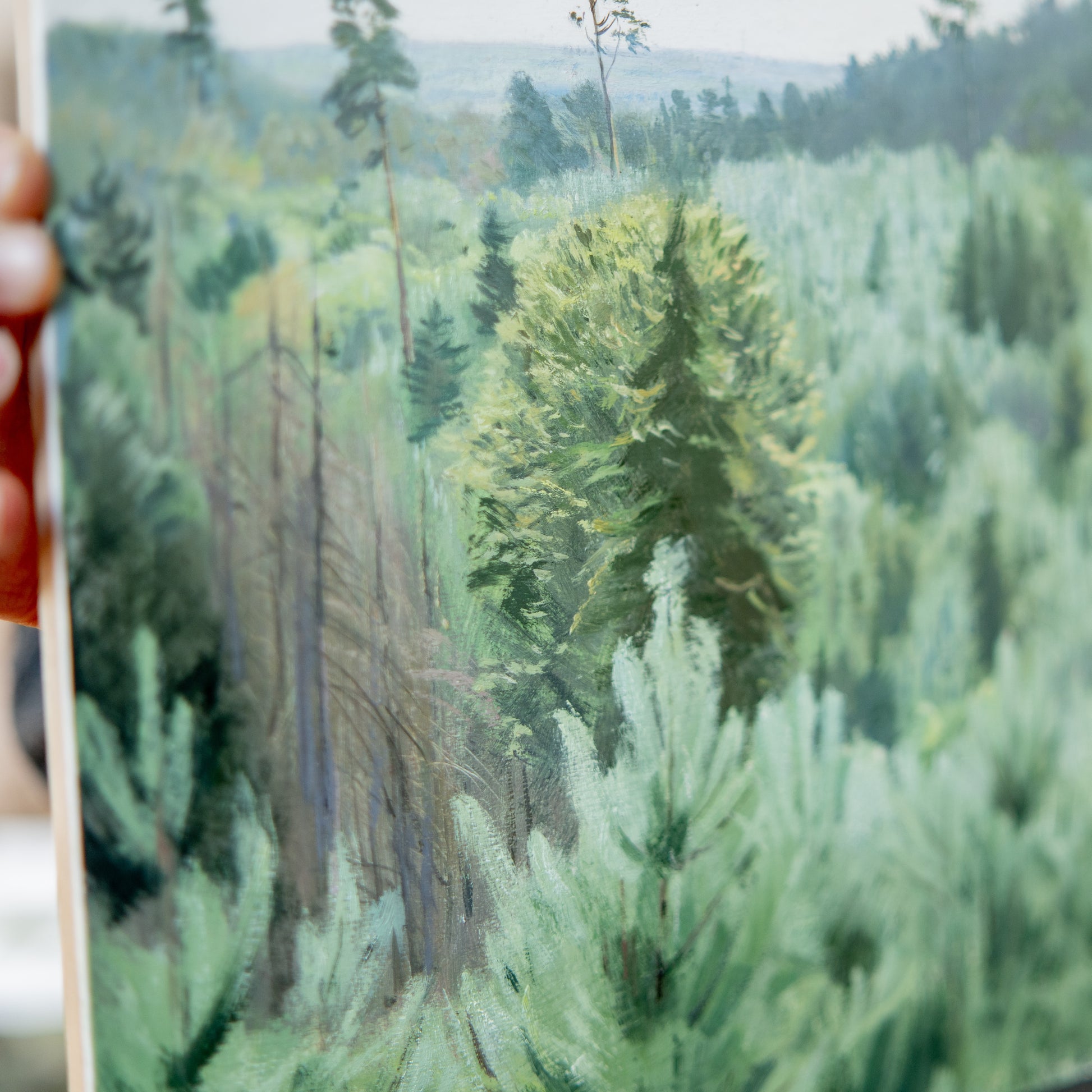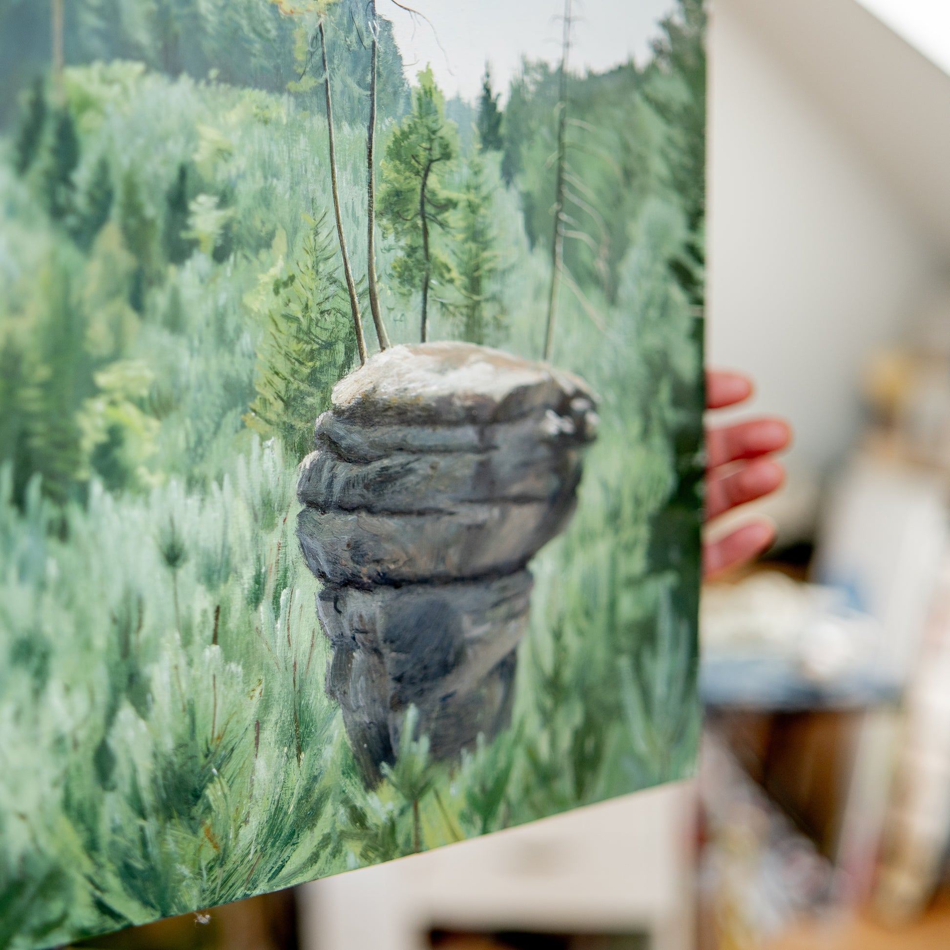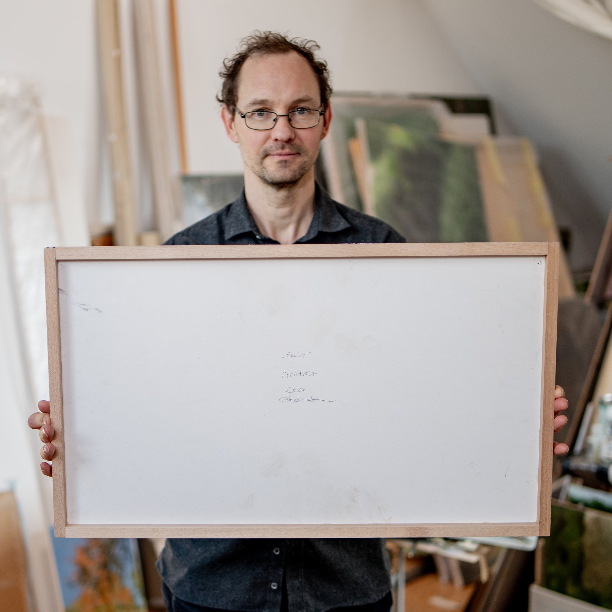 "V roce 2019 jsem si nedaleko Želíz vyhlídl skalní útvar zvaný Pýchavka, který se tehdy tyčil nad hlubokým údolím a výrazně vystupoval z holých kopců. Bylo to velmi efektní a já se chtěl na to místo vrátit a namalovat ho. V roce 2024 se mi to konečně podařilo, ale krajina i atmosféra se mezitím změnila. Pýchavka už se netyčí tak výrazně a zčásti ji zakrývají rychle rostoucí borovice." - Zdeněk Daněk